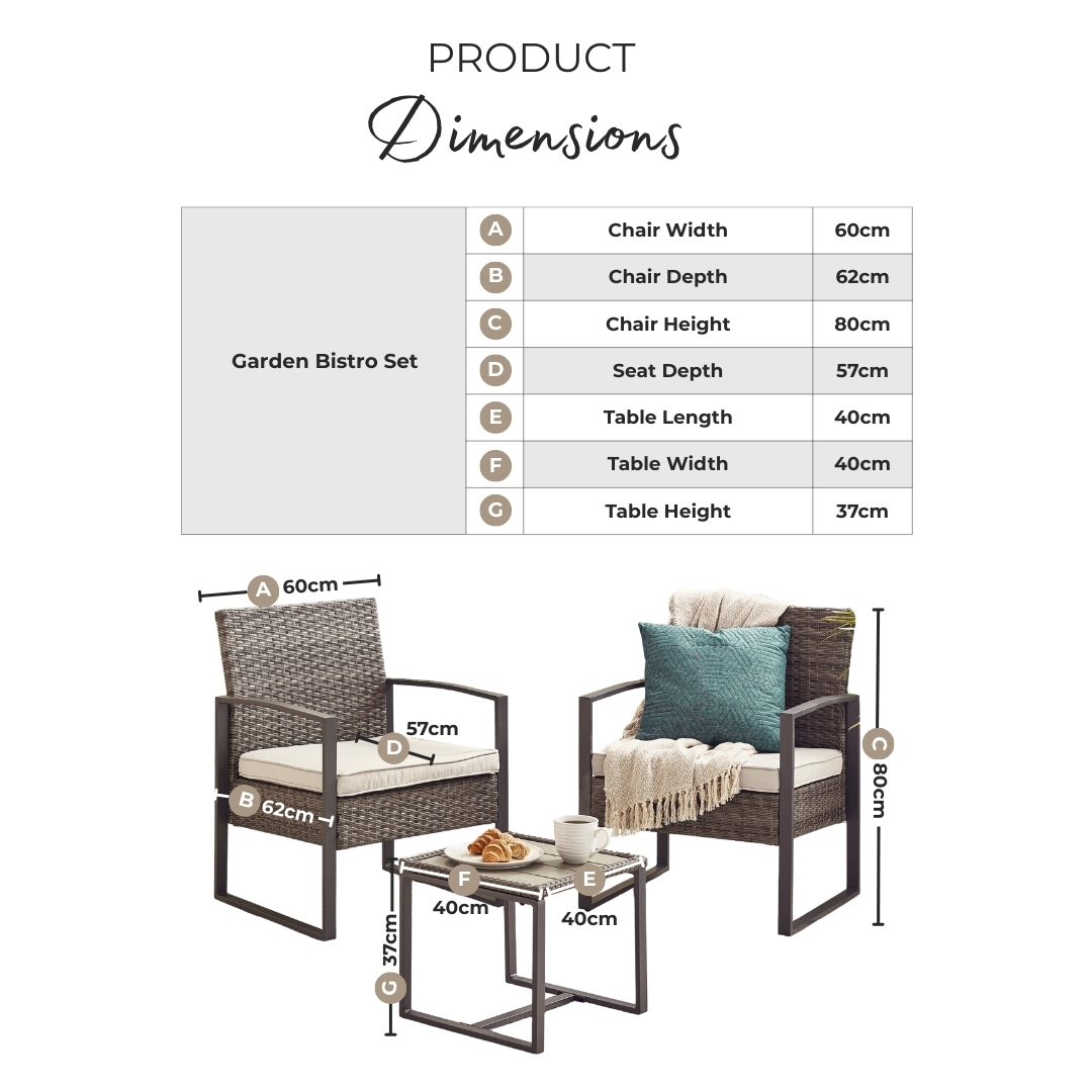 Width (cm) 60 Height (cm) 80 Depth (cm) 62 Colour Beige Material Rattan Finish Rattan Feature 1 2 seater outdoor chairs and small square coffee table bistro set in beige PE rattan Feature 2 Modern rustic meets industrial style Feature 3 On trend black steel metal square arms and legs Feature 4 UV and weather resistant table and chair frames, splash-proof cushions Feature 5 Includes a FREE water resistant cover + 2 year warranty delivery_time Free next working day delivery available delivery_pick_a_day Pick a delivery day to suit you delivery_door_to_door Door to door delivery. Delivery to flats cannot be taken up stairs or in lifts Chair Finish Rattan Chair Frame Material Metal Feet Material Plastic Chair Upholstery Material Fabric Rattan Type Poly Rattan Water Resistant Cushion Yes Chair Cushion Colour Cream UV Resistant Yes Chair Frame Colour Grey Chair Depth (cm) 62 Chair Width (cm) 60 Chair Height (cm) 80 Chair Back Height (cm) 42 Seating Depth (cm) 57 Seat Height (cm) 45 Seat Padding Thickness (cm) 5 Table Shape Square Table Colour Beige Table Material Metal Table Surface Thickness (cm) 2.5 Table Type Side Table Number Of Seats 2 Table Height (cm) 37 Table Width (cm) 40 Table Length (cm) 40 Seat Weight Capacity PP (kg) 120 Table Weight Capacity (kg) 30 Product Weight (kg) 19.7 Assembly Details Assembly Required Date Listed 2025-02-20T00:00:00.000Z merch_category Garden Bistro Sets _promo_message Save 20% on Garden Furniture With Code: EARLY20 custom_badge #914e3b|#ffffff|20% off with code Sister SKUs ALG-OUT-CHR-SET-BLK,ALG-OUT-CHR-SET-GRY Swatch Colour Beige Additional Lead Time 0 Chair Weight (kg) 7.05 Arm Height (cm) 58 Table Finish Powder Coated Table Base Width (cm) 40 merch_rank 1539 Display Variant Yes -