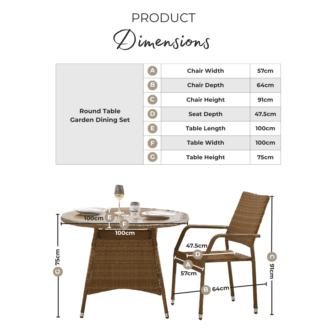 Width (cm) 100 Height (cm) 75 Depth (cm) 100 Sister SKUs ANT-RND-OUT-TBL-GRY-4,ANT-RND-OUT-TBL-NAT-4 Display Variant Yes Colour Brown Material Rattan Finish Rattan Feature 1 Brown rattan 4 seat round garden dining table and 4 stackable chairs Feature 2 Weather-resistant PE rattan on steel frame Feature 3 Fully assembled chairs; minimal assembly required for table with easy-to-follow instructions Feature 4 Modern simple design will suit all home and outdoor styles Feature 5 Includes a FREE water resistant cover + 2 year warranty delivery_time Free next working day delivery available on orders before 8pm* delivery_pick_a_day Pick a delivery day to suit you delivery_door_to_door Door to door delivery. Delivery to flats cannot be taken up stairs or in lifts Chair Finish Rattan Chair Frame Material Metal Feet Material Plastic Rattan Type Poly Rattan Water Resistant Cushion No UV Resistant Yes Chair Frame Colour Brown Chair Depth (cm) 64 Chair Width (cm) 57 Chair Height (cm) 91 Chair Back Height (cm) 30 Seating Depth (cm) 47.5 Chair Weight (kg) 5 Seat Height (cm) 45 Arm Height (cm) 65 Table Shape Round Table Colour Brown Table Material Rattan Table Finish Rattan Table Base Width (cm) 67 Table Surface Thickness (cm) 0.5 Table Type Dining table Number Of Seats 4 Table Height (cm) 75 Table Width (cm) 100 Table Length (cm) 100 Seat Weight Capacity PP (kg) 120 Table Weight Capacity (kg) 60 Product Weight (kg) 38 Assembly Details Assembly Required Intro Offer? No Date Listed 2025-10-01T00:00:00.000Z Swatch Colour Brown merch_category Garden Dining Sets _promo_message Garden Sale Now On | Free Next Day Delivery Additional Lead Time 0 merch_rank 314 USP Feature 1 Free Protective Cover Included USP Feature 1 Description Waterproof outdoor cover included at no extra cost to help protect your furniture from rain, dirt and debris when not in use. USP Feature 2 High-Density Double-Weave PE Rattan USP Feature 2 Description Durable synthetic rattan with a textured double weave for a premium look that's built to last outdoors. USP Feature 3 Powder-Coated Aluminium Frame USP Feature 3 Description Rust-resistant aluminium frame provides strength, stability and long-term outdoor durability. USP Feature 4 Space-Saving Stackable Design USP Feature 4 Description Chairs stack neatly for convenient storage, ideal for maximising space. USP Feature 5 Easy Clean USP Feature 5 Description Smooth, wipe-clean surfaces make everyday cleaning quick and hassle-free. USP Feature 6 Tempered Safety Glass Top USP Feature 6 Description Safety-tested tempered glass surface offers enhanced strength and easy cleaning. Collection Antigua USP Feature 2 Image https://s3-eu-west-1.amazonaws.com/cdn.production.aws.eu-w1.pimberly.com/public/asset/raw/5fbbce1a2fd14f001bd75232/23a93167/69bc217804511b42cc000052/ANT-RND-OUT-TBL-BRN-4_USP2.jpg USP Feature 3 Image https://s3-eu-west-1.amazonaws.com/cdn.production.aws.eu-w1.pimberly.com/public/asset/raw/5fbbce1a2fd14f001bd75232/23a93167/69bc217804511b42cc000053/ANT-RND-OUT-TBL-BRN-4_USP3.jpg USP Feature 5 Image https://s3-eu-west-1.amazonaws.com/cdn.production.aws.eu-w1.pimberly.com/public/asset/raw/5fbbce1a2fd14f001bd75232/23a93167/69bc217804511b42cc000055/ANT-RND-OUT-TBL-BRN-4_USP5.jpg USP Feature 6 Image https://s3-eu-west-1.amazonaws.com/cdn.production.aws.eu-w1.pimberly.com/public/asset/raw/5fbbce1a2fd14f001bd75232/23a93167/69bc217804511b42cc000056/ANT-RND-OUT-TBL-BRN-4_USP6.jpg USP Feature 4 Image https://s3-eu-west-1.amazonaws.com/cdn.production.aws.eu-w1.pimberly.com/public/asset/raw/5fbbce1a2fd14f001bd75232/23a93167/69bc217804511b42cc000054/ANT-RND-OUT-TBL-BRN-4_USP4.png USP Feature 1 Image https://s3-eu-west-1.amazonaws.com/cdn.production.aws.eu-w1.pimberly.com/public/asset/raw/5fbbce1a2fd14f001bd75232/23a93167/69bc217804511b42cc000051/ANT-RND-OUT-TBL-BRN-4_USP1.png -