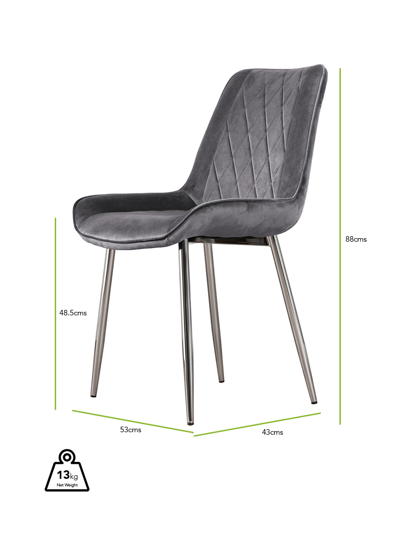 Modernise your dining area with our luxurious velvet upholstered Pesaro Dining Chairs. With a nod to the Mid-century modern design era, the Pesaro features gorgeous textured diamond stitching with an ergonomically designed curved seat pad blending seamlessly to the supporting medium high back rest. Sat atop elegant slightly tapered legs in black, chrome or gold effect. The Pesaro is a perfect match to any dining table or use as a luxe vanity seat in the bedroom, as an occasional chair for the living area or to add a bit of luxury to your home office.