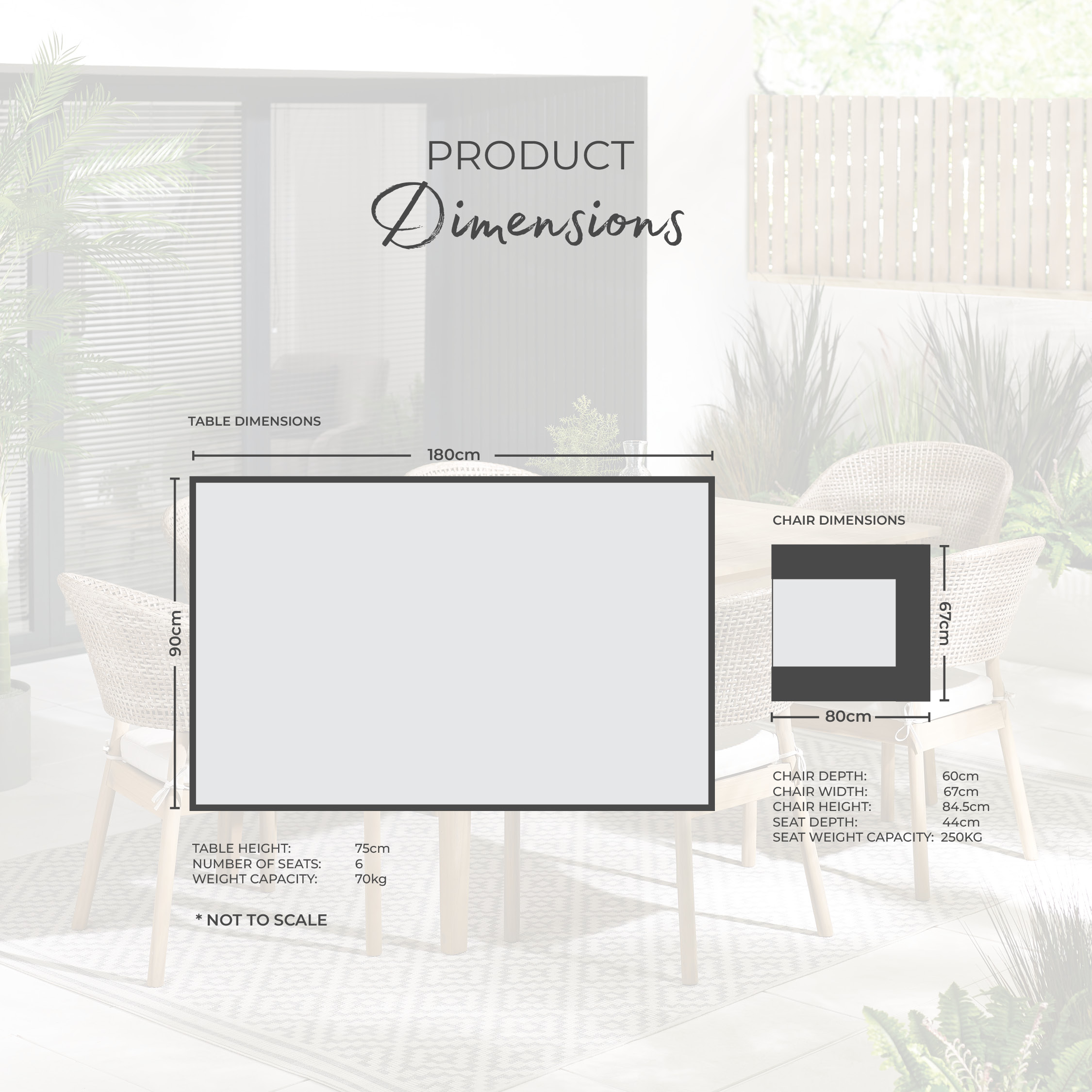 Width (cm) 90 Height (cm) 75 Depth (cm) 252 Colour Natural Material Wood Finish Natural Feature 1 IMPORTANT: this is a pre-order item with delivery due March 2026 Feature 2 Includes rectangular wood dining table + 6 wood & wicker dining chairs Feature 3 6 stackable outdoor chairs with light brown synthetic rattan 'wicker effect' backs Feature 4 Solid FSC® certified acacia wood in teak stain colour Feature 5 1 year warranty delivery_time Available for pre order delivery_pick_a_day Pick a delivery day to suit you delivery_door_to_door Delivered to the room of your choice, up to two flights of stairs Chair Finish Natural Chair Frame Material Wood Chair Upholstery Material Fabric Water Resistant Cushion Yes Chair Cushion Colour Cream UV Resistant Yes Chair Frame Colour Natural Chair Depth (cm) 61 Chair Width (cm) 53.5 Chair Height (cm) 84.5 Chair Back Height (cm) 37.5 Seating Depth (cm) 45 Chair Weight (kg) 7 Seat Height (cm) 47 Arm Height (cm) 64.5 Table Shape Rectangular Table Colour Natural Table Material Wood Table Finish Natural Table Base Width (cm) 90 Table Surface Thickness (cm) 1.8 Table Type Dining table Number Of Seats 6 Table Height (cm) 75 Table Width (cm) 90 Table Length (cm) 180 Table Weight Capacity (kg) 75 Product Weight (kg) 36 Intro Offer? No Date Listed 2025-01-28T00:00:00.000Z merch_category Garden Dining Sets Additional Lead Time 3 _promo_message Save 20% on Garden Furniture With Code: EARLY20 custom_badge #3d4e55|#ffffff|Limited Pre-Order Feature 6 6 seat outdoor wood & wicker dining set Display Variant Yes Swatch Colour Wood Seat Weight Capacity PP (kg) 110 Assembly Details Assembly Required Seat Padding Thickness (cm) 5 -