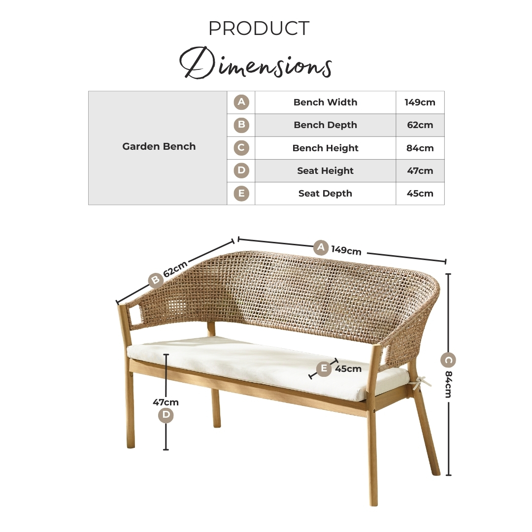 Width (cm) 149 Height (cm) 84 Depth (cm) 62 Display Variant Yes Colour Natural Material Wood Finish Natural Feature 1 Solid wood and wicker style outdoor garden bench with cream seat pad Feature 2 Solid FSC®certified acacia wood in teak stain colour with synthetic rattan 'wicker effect' back Feature 3 Seat pad is durable Olefin fabric Feature 4 Seats up to 3 Feature 5 1 year warranty delivery_time Available for pre order delivery_pick_a_day Pick a delivery day to suit you delivery_door_to_door Door to door delivery. Delivery to flats cannot be taken up stairs or in lifts Chair Finish Natural Chair Frame Material Wood Chair Upholstery Material Fabric Water Resistant Cushion Yes Chair Cushion Colour Cream UV Resistant Yes Chair Frame Colour Natural Chair Depth (cm) 62 Chair Width (cm) 135 Chair Height (cm) 84 Seating Depth (cm) 45 Chair Weight (kg) 14.4 Seat Height (cm) 47 Number Of Seats 2 Seat Weight Capacity PP (kg) 110 Product Weight (kg) 14.4 Assembly Details Assembly Required Intro Offer? No Date Listed 2026-02-02T00:00:00.000Z Swatch Colour Wood merch_category Garden Benches _promo_message Save 20% on Garden Furniture With Code: EARLY20 custom_badge #3d4e55|#ffffff|Limited Pre-Order Additional Lead Time 19 Chair Back Height (cm) 37.5 Arm Height (cm) 64.5 Seat Padding Thickness (cm) 5 -