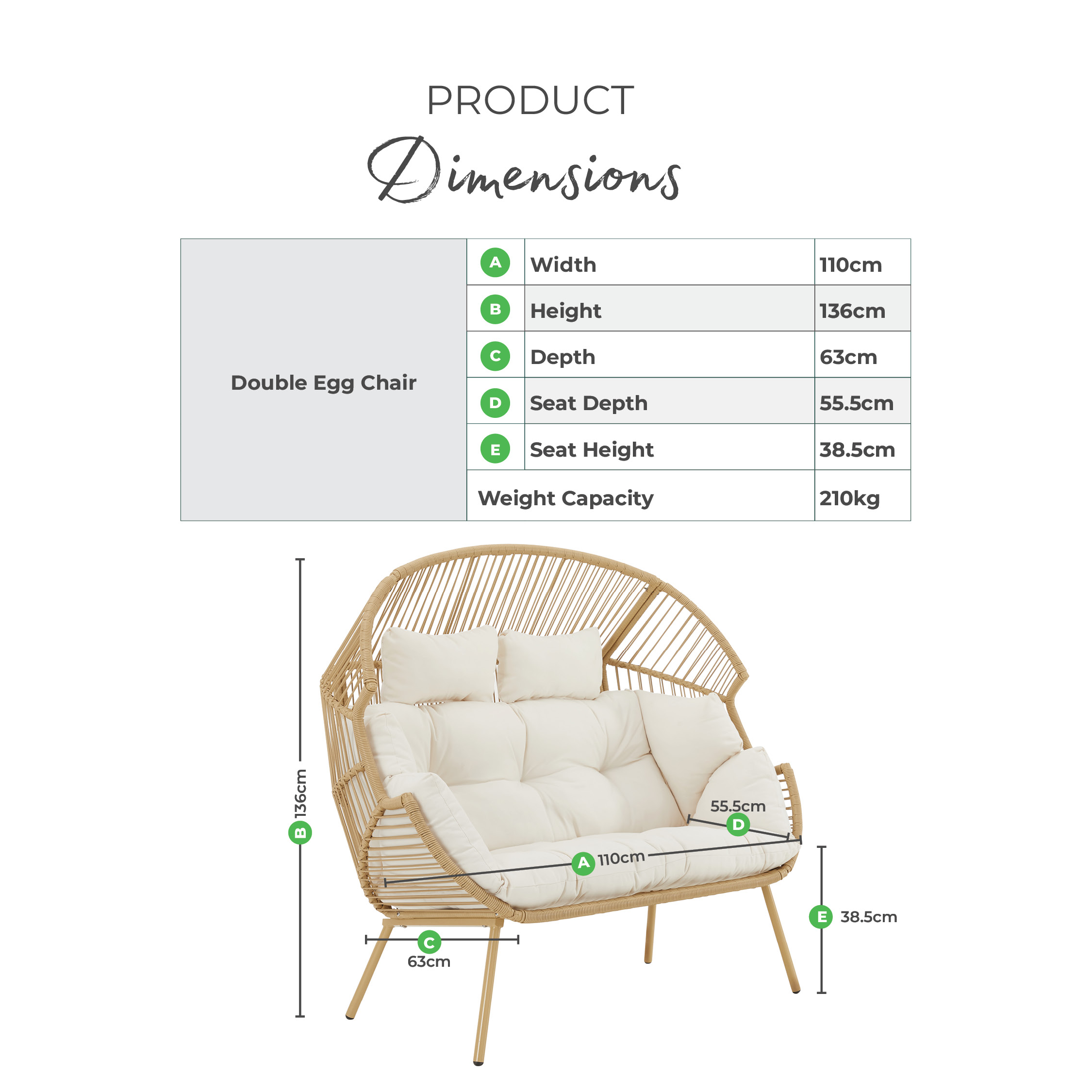 Width (cm) 145 Height (cm) 137 Depth (cm) 84 Display Variant Yes Colour Wood Material Rattan Finish Upholstered Feature 1 Cosy double egg chair for both indoor and outdoor use Feature 2 Textured light brown PE rattan weave for a natural look Feature 3 Thick cream cushions Feature 4 UV and weather resistant chair frame, splash-proof cushions Feature 5 1 year warranty delivery_time Free next working day delivery available on orders before 8pm* delivery_pick_a_day Pick a delivery day to suit you delivery_door_to_door Door to door delivery. Delivery to flats cannot be taken up stairs or in lifts Chair Finish Powder Coated Chair Frame Material Metal Feet Material Metal Chair Upholstery Material Fabric Rattan Type Poly Rattan Water Resistant Cushion Partial Chair Cushion Colour Cream UV Resistant Partial Chair Frame Colour Black Chair Depth (cm) 84 Chair Width (cm) 146 Chair Height (cm) 136 Chair Back Height (cm) 136 Seating Depth (cm) 55.5 Chair Weight (kg) 23.65 Seat Height (cm) 38.5 Arm Height (cm) 68 Seat Padding Thickness (cm) 10 Back Padding Thickness (cm) 10 Number Of Seats 2 Seat Weight Capacity PP (kg) 105 Product Weight (kg) 24 Assembly Details Assembly Required Weight Capacity 210 Intro Offer? No Date Listed 2025-09-25T00:00:00.000Z merch_category Accent Chairs -