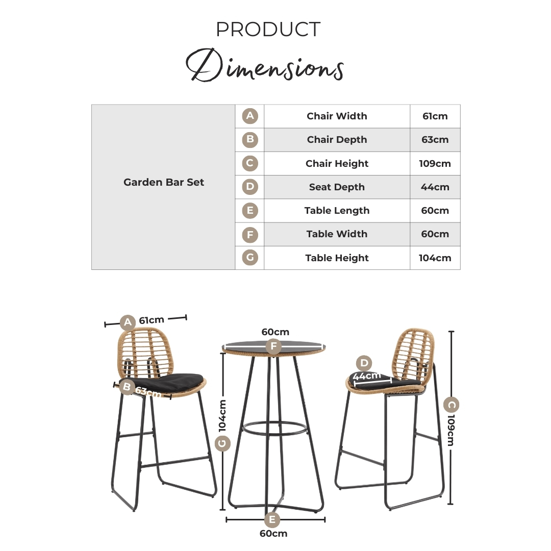 Width (cm) 60 Height (cm) 104 Depth (cm) 60 Colour Beige Material Rattan Finish Rattan Feature 1 2 seater outdoor bar chairs and small round bar table bistro set in beige PE rattan with cream cushions Feature 2 Modern boho rustic meets industrial style Feature 3 On trend black steel metal hairpin legs Feature 4 UV and weather resistant table and chair frames, splash-proof cushions Feature 5 1 year warranty delivery_time Free next working day delivery available on orders before 8pm* delivery_pick_a_day Pick a delivery day to suit you delivery_door_to_door Door to door delivery. Delivery to flats cannot be taken up stairs or in lifts Chair Finish Rattan Chair Frame Material Metal Feet Material Plastic Chair Upholstery Material Fabric Rattan Type Poly Rattan Water Resistant Cushion Yes Chair Cushion Colour Cream UV Resistant Yes Chair Frame Colour Black Chair Depth (cm) 63 Chair Width (cm) 61 Chair Height (cm) 109 Chair Back Height (cm) 36 Seating Depth (cm) 44 Chair Weight (kg) 6 Seat Height (cm) 73 Seat Padding Thickness (cm) 4 Table Shape Round Table Colour Beige Table Material Rattan Table Finish Rattan Table Base Width (cm) 60 Table Surface Thickness (cm) 0.5 Table Type Bar Table Number Of Seats 2 Table Height (cm) 104 Table Width (cm) 60 Table Length (cm) 60 Seat Weight Capacity PP (kg) 120 Table Weight Capacity (kg) 30 Product Weight (kg) 18.75 Assembly Details Assembly Required Date Listed 2025-02-06T00:00:00.000Z Additional Lead Time 0 merch_category Garden Bar Sets _promo_message Save 20% on Garden Furniture With Code: EARLY20 custom_badge #914e3b|#ffffff|20% off with code Sister SKUs BEL-OUT-BAR-SET-NAT-BLK Display Variant Yes Swatch Colour Cream merch_rank 1191 -