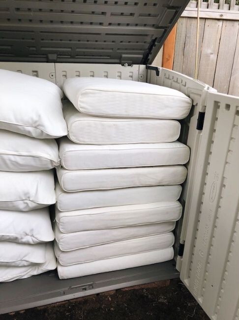 Not only will rain and moisture ruin your cushions (even splash proof and weather-proof options can go mouldy is exposed to prolonged damp), but any moisture trapped in on under cushions can transfer into the wood. Store cushions indoors or in a waterproof outdoor box to keep both the fabric and the furniture in great shape.