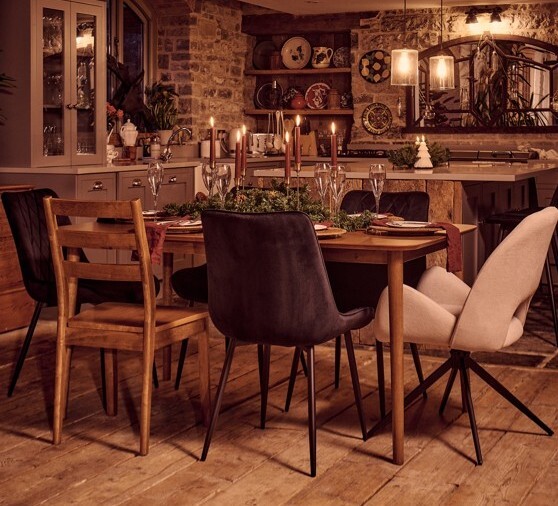 We're mixing materials and designs with style here, with our Pesaro black velvet dining chairs, Layla cream fabric swivel dining chair and Lynton wood dining chair around our Lynton walnut wood dining table for a Christmas set up full of character and charm.