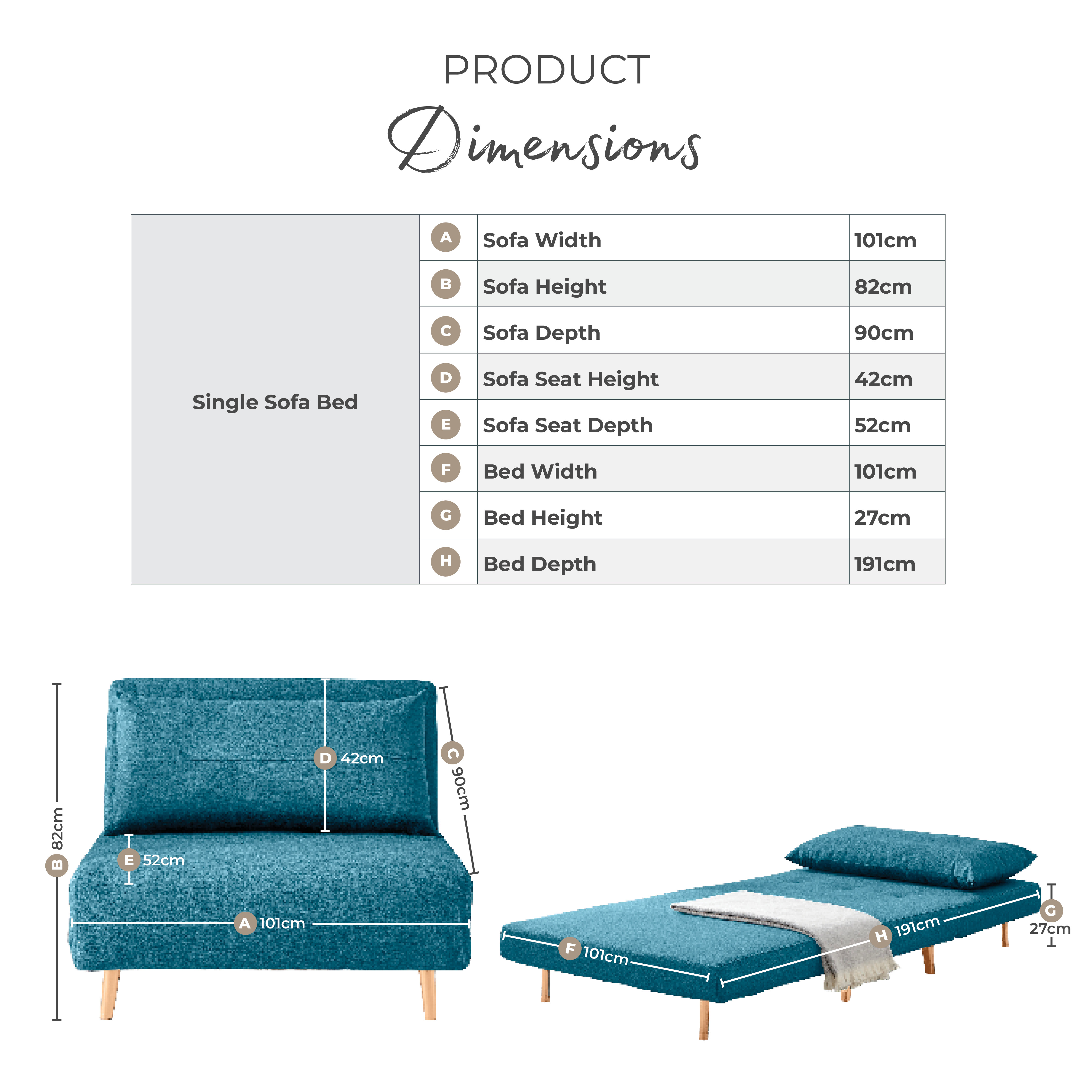 Width (cm) 101 Height (cm) 82 Depth (cm) 90 Colour Grey Finish Upholstered Feature 1 Folding sofa bed - from armchair to single bed in moments Feature 2 Simple, modern streamlined design upholstered dark grey fabric Feature 3 Smooth click-clack mechanism Feature 4 Quick assembly with minimal parts Feature 5 2 year warranty Sofa Type Sofa Bed Sofa Cushion Material Fabric Scatter Cushion Material Fabric Sofa Seat Depth (cm) 52 Sofa Seat Width (cm) 102 Sofa Back Height (cm) 42 Sofa Frame Material Wood Seat Material Fabric Sofa Colour Dark Grey delivery_time Free next working day delivery available on orders before 8pm* delivery_pick_a_day Pick a delivery day to suit you delivery_door_to_door Door to door delivery. Delivery to flats cannot be taken up stairs or in lifts Product Weight (kg) 24.7 Assembly Details Assembly Required Weight Capacity 150kg merch_category Sofas Leg Colour Wood Material Fabric Sister SKUs BOBB-SOF-BED-SNG-FAB-BLU Swatch Colour Dark Grey Firmness 5 - Firm Numberofseats 1 Sofa Leg Material Solid Wood _promo_message Save 10% - Use Code FEB10 Display Variant Yes Additional Lead Time 0 custom_badge #914e3b|#ffffff|10% off with code merch_rank 148 -