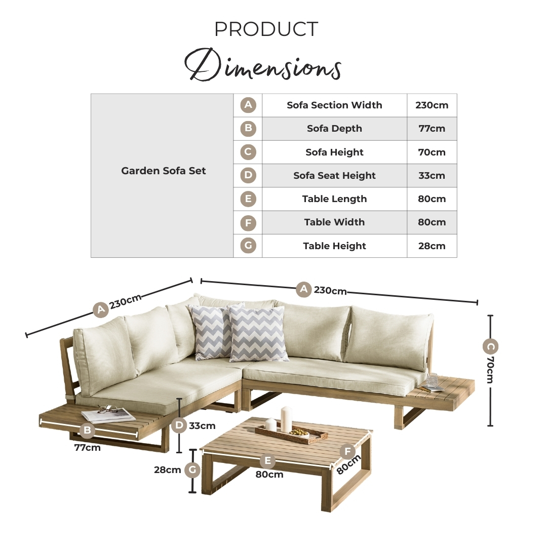 Width (cm) 236 Height (cm) 76 Depth (cm) 188 Colour White Material Wood Finish Painted Feature 1 5 / 6 seat outdoor corner sofa Feature 2 Solid FSC® certified acacia wood in pale limewash finish with grey cushions Feature 3 In built end tables and matching coffee table Feature 4 Stylish, bright and airy Scandi-influenced design Feature 5 1 year warranty delivery_time !Please Note! - Free delivery with earliest delivery in 2 working days* delivery_pick_a_day Pick a delivery day to suit you delivery_door_to_door Delivered to the room of your choice, up to two flights of stairs Chair Finish Painted Chair Frame Material Wood Feet Material Plastic Chair Upholstery Material Fabric Water Resistant Cushion Yes Chair Cushion Colour Grey UV Resistant Yes Chair Frame Colour White Chair Depth (cm) 78 Chair Height (cm) 76 Chair Back Height (cm) 43 Seating Depth (cm) 55 Seat Height (cm) 33 Seat Padding Thickness (cm) 7 Back Padding Thickness (cm) 20 Table Shape Square Table Colour White Table Material Wood Table Finish Painted Table Base Width (cm) 80 Table Surface Thickness (cm) 1.2 Table Type Coffee table Number Of Seats 6 Table Height (cm) 28 Table Width (cm) 80 Table Length (cm) 80 Seat Weight Capacity PP (kg) 110 Table Weight Capacity (kg) 50 Product Weight (kg) 73.5 Assembly Details Assembly Required Date Listed 2025-02-06T00:00:00.000Z Additional Lead Time 1 merch_category Garden Sofa Sets _promo_message Garden Sale Now On | Free and Fast Delivery Swatch Colour White Sister SKUs BRIS-OUT-SOF-6-NAT,BRIS-OUT-SOF-6-NAT-GRN,BRIS-OUT-SOF-6-WAL merch_rank 754 Display Variant Yes USP Feature 1 Solid Wood USP Feature 1 Description Crafted from solid wood for natural strength and stability. USP Feature 2 Exceptionally Durable & Long-Lasting USP Feature 2 Description Acacia is a dense hardwood that resists scratches, dents, and everyday wear- ideal for dining and living furniture that sees regular use. USP Feature 3 UV-Resistant Materials USP Feature 3 Description Designed to help prevent fading and sun damage, maintaining colour and appearance over time. USP Feature 4 Splash-Proof Cushions USP Feature 4 Description Cushion covers help repel moisture and are quick drying after light rain. USP Feature 5 Natural & Unique Finish USP Feature 5 Description Acacia Wood has a rich, unique grain pattern giving your space an individual, artisanal feel. USP Feature 6 Stylish Yet Functional Design USP Feature 6 Description Combines contemporary outdoor styling with everyday practicality. Collection Brisa USP Feature 1 Image https://s3-eu-west-1.amazonaws.com/cdn.production.aws.eu-w1.pimberly.com/public/asset/raw/5fbbce1a2fd14f001bd75232/57edc047/69bd80e304511b44880000bf/BRIS-OUT-SOF-6-WHT_USP1.jpg USP Feature 2 Image https://s3-eu-west-1.amazonaws.com/cdn.production.aws.eu-w1.pimberly.com/public/asset/raw/5fbbce1a2fd14f001bd75232/57edc047/69bd80e304511b44880000c0/BRIS-OUT-SOF-6-WHT_USP2.jpg USP Feature 4 Image https://s3-eu-west-1.amazonaws.com/cdn.production.aws.eu-w1.pimberly.com/public/asset/raw/5fbbce1a2fd14f001bd75232/57edc047/69bd80e304511b44880000c2/BRIS-OUT-SOF-6-WHT_USP4.jpg USP Feature 5 Image https://s3-eu-west-1.amazonaws.com/cdn.production.aws.eu-w1.pimberly.com/public/asset/raw/5fbbce1a2fd14f001bd75232/57edc047/69bd80e304511b44880000c3/BRIS-OUT-SOF-6-WHT_USP5.jpg USP Feature 6 Image https://s3-eu-west-1.amazonaws.com/cdn.production.aws.eu-w1.pimberly.com/public/asset/raw/5fbbce1a2fd14f001bd75232/57edc047/69bd80e304511b44880000c4/BRIS-OUT-SOF-6-WHT_USP6.jpg -