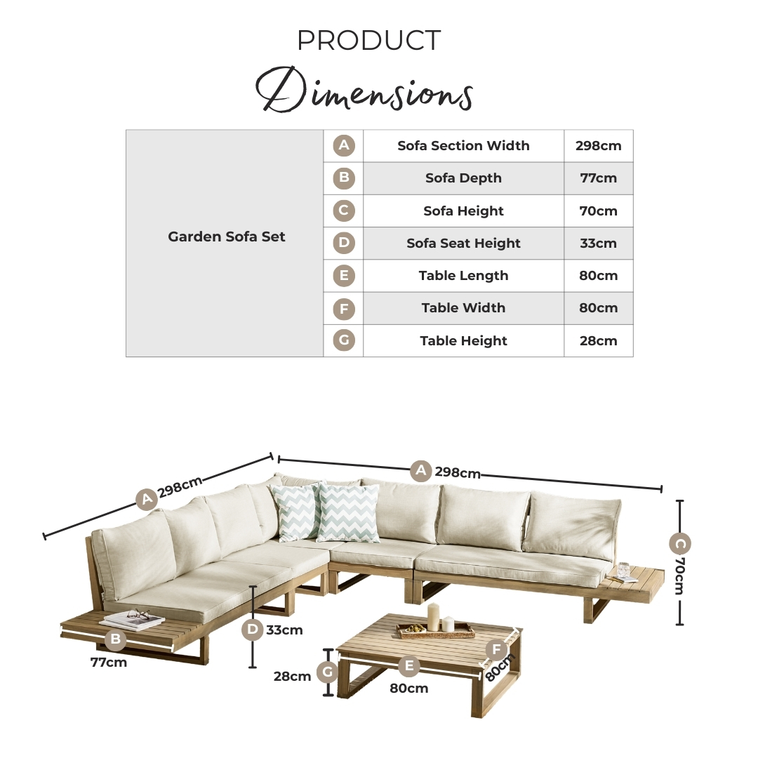 Width (cm) 298 Height (cm) 76 Depth (cm) 188 Sister SKUs BRIS-OUT-SOF-8-NAT,BRIS-OUT-SOF-8-NAT-GRN,BRIS-OUT-SOF-8-WAL Display Variant Yes Feature 1 8 seat outdoor garden corner sofa Feature 2 Solid FSC®certified acacia wood in limewash white stain colour with grey cushions Feature 3 In built end tables and matching coffee table Feature 4 Stylish French Farmhouse meets Scandi-influenced design Feature 5 1 year warranty delivery_time Available for pre order delivery_pick_a_day Pick a delivery day to suit you delivery_door_to_door Door to door delivery. Delivery to flats cannot be taken up stairs or in lifts Chair Frame Material Wood Chair Depth (cm) 78 Chair Width (cm) 62 Chair Height (cm) 76 Chair Back Height (cm) 43 Seating Depth (cm) 55 Chair Weight (kg) 17 Seat Height (cm) 33 Seat Padding Thickness (cm) 7 Back Padding Thickness (cm) 20 Table Shape Square Table Colour Grey Table Material Wood Table Finish Painted Table Base Width (cm) 80 Table Surface Thickness (cm) 1.2 Table Type Coffee table Number Of Seats 8 Table Height (cm) 28 Table Width (cm) 80 Table Length (cm) 80 Seat Weight Capacity PP (kg) 110 Table Weight Capacity (kg) 50 Product Weight (kg) 97.5 Intro Offer? No Date Listed 2026-02-02T00:00:00.000Z Swatch Colour White merch_category Garden Sofa Sets custom_badge #3d4e55|#ffffff|Limited Pre-Order _promo_message Save 20% on Garden Furniture With Code: EARLY20 Additional Lead Time 9 -
