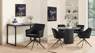 Our pair of 2 Calla black faux leather swivel dining chairs with black legs will be the perfect addition to your kitchen or dining room. Stylish yet practical, swivel chairs are great for narrower spaces as you don't need to push them back from a table to stand up. This all black look gives a sleek industrial and minimalist look that will suit a range of modern home styles.