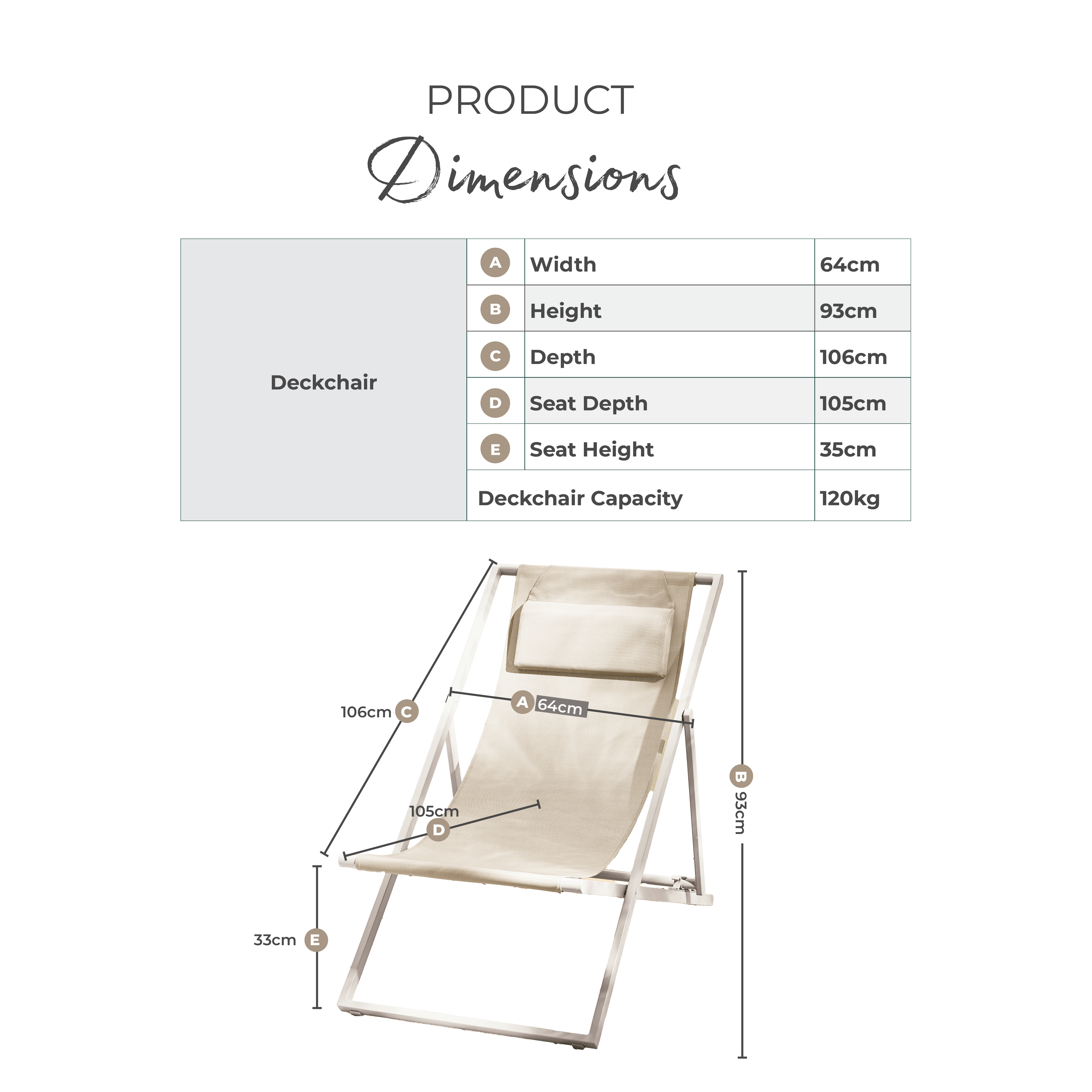 Width (cm) 64 Height (cm) 93 Depth (cm) 105 Colour Cream Material Metal Finish Powder Coated Feature 1 Pair of cream deckchairs in simple yet sweet design Feature 2 Cream powder coated metal & cream textilene material with inbuilt foam headrest pillow Feature 3 Folds flat for easy storage Feature 4 Sturdy and highly durable outdoor pieces Feature 5 Comes fully assembled & with 1 year warranty delivery_time Free next working day delivery available on orders before 8pm* delivery_pick_a_day Pick a delivery day to suit you delivery_door_to_door Door to door delivery. Delivery to flats cannot be taken up stairs or in lifts Chair Finish Powder Coated Chair Frame Material Metal Feet Material Metal Chair Upholstery Material Plastic Chair Cushion Colour Cream UV Resistant Partial Chair Frame Colour Cream Chair Depth (cm) 105 Chair Width (cm) 64 Chair Height (cm) 93 Chair Back Height (cm) 93 Seating Depth (cm) 105 Chair Weight (kg) 3.75 Seat Height (cm) 28 Number Of Seats 2 Seat Weight Capacity PP (kg) 120 Product Weight (kg) 7.5 Assembly Details Assembly Required Date Listed 2025-02-13T00:00:00.000Z merch_category Outdoor Additional Lead Time 0 _promo_message Save 20% on Garden Furniture With Code: EARLY20 custom_badge #914e3b|#ffffff|20% off with code -