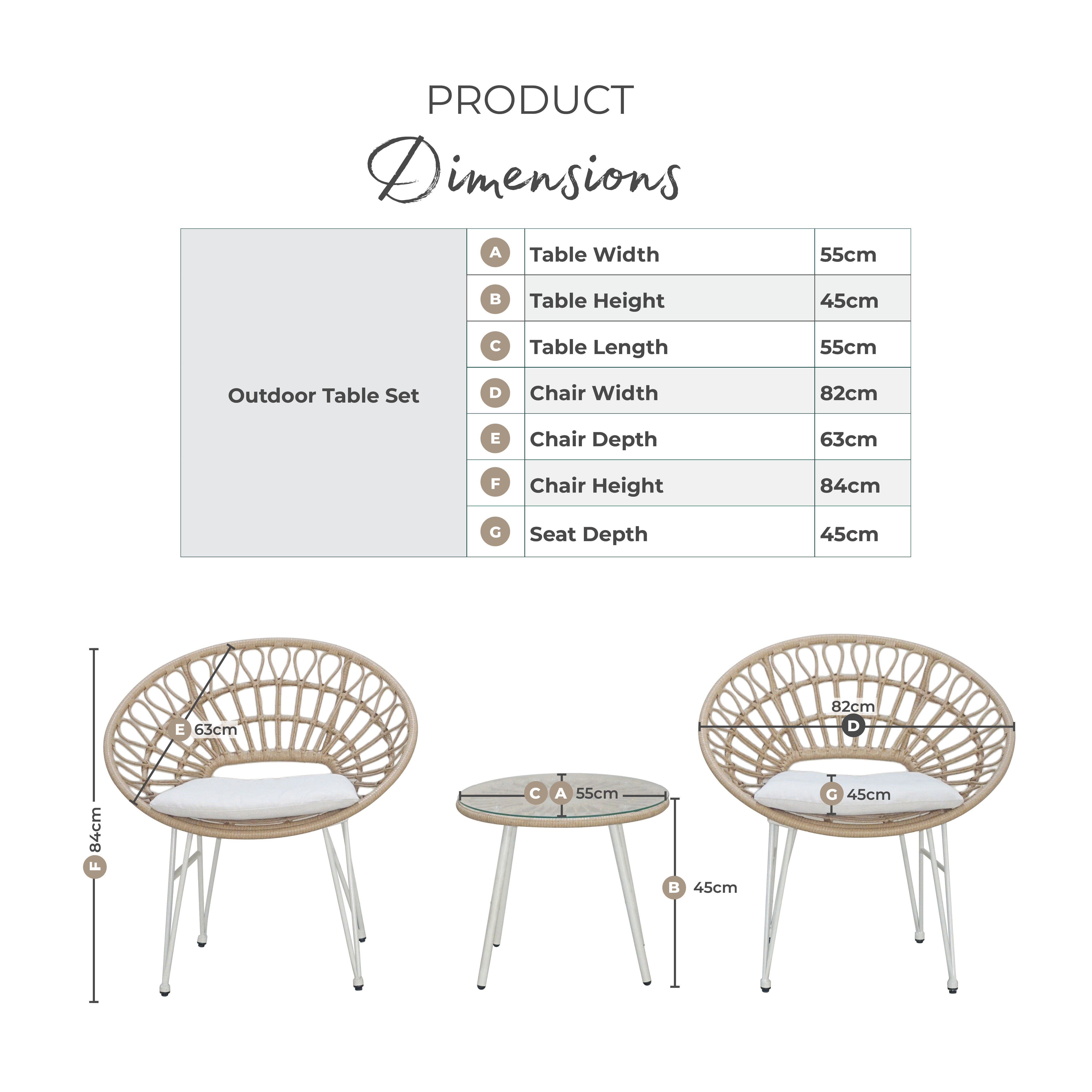 Width (cm) 82 Height (cm) 84 Depth (cm) 63 Colour Beige Material Metal Finish Powder Coated Feature 1 Stylish 2 chair and small table outdoor bistro set Feature 2 Stunning round chairs with looped details Feature 3 Cream metal legs and beige PE rattan Feature 4 Comes with matching round glass-topped table Feature 5 2 year warranty delivery_time Free next working day delivery available on orders before 8pm* delivery_pick_a_day Pick a delivery day to suit you delivery_door_to_door Door to door delivery. Delivery to flats cannot be taken up stairs or in lifts Chair Finish Powder Coated Chair Frame Material Metal Feet Material Plastic Chair Upholstery Material Fabric Rattan Type Poly Rattan Water Resistant Cushion Yes Chair Cushion Colour Cream UV Resistant Yes Chair Frame Colour Cream Chair Depth (cm) 63 Chair Width (cm) 82 Chair Height (cm) 84 Seating Depth (cm) 45 Chair Weight (kg) 6.1 Seat Height (cm) 44 Seat Padding Thickness (cm) 4 Table Shape Round Table Colour Beige Table Material Metal Table Finish Powder Coated Table Base Width (cm) 55 Table Surface Thickness (cm) 0.5 Table Type Side Table Number Of Seats 2 Table Height (cm) 45 Table Width (cm) 55 Table Length (cm) 55 Seat Weight Capacity PP (kg) 120 Table Weight Capacity (kg) 30 Product Weight (kg) 18 Assembly Details Assembly Required Additional Lead Time 0 Date Listed 2025-02-27T00:00:00.000Z merch_category Garden Bistro Sets _promo_message Garden Sale Now On | Free Next Day Delivery Display Variant Yes Swatch Colour Beige merch_rank 1870 USP Feature 1 Hand-Woven PE Rattan Finish USP Feature 1 Description Synthetic rattan woven for strength and durability, offering the look of natural wicker without the maintenance. USP Feature 2 Corrosion-Resistant Aluminium Frame USP Feature 2 Description Powder-coated aluminium construction helps prevent rust and corrosion over time. USP Feature 3 UV-Resistant Materials USP Feature 3 Description Designed to help prevent fading and sun damage, maintaining colour and appearance over time. USP Feature 4 Splash-Proof Cushions USP Feature 4 Description Cushion covers help repel moisture and are quick drying after light rain. USP Feature 5 Tempered Safety Glass Top USP Feature 5 Description Safety-tested tempered glass surface offers enhanced strength and easy cleaning. USP Feature 6 Easy Assembly USP Feature 6 Description Designed for simple assembly with clear instructions included. Collection Crete USP Feature 1 Image https://s3-eu-west-1.amazonaws.com/cdn.production.aws.eu-w1.pimberly.com/public/asset/raw/5fbbce1a2fd14f001bd75232/b1a3f042/69c27f2d04511b6cbb000039/CRET-OUT-CHR-SET-NAT-CRM_USP1.jpg USP Feature 2 Image https://s3-eu-west-1.amazonaws.com/cdn.production.aws.eu-w1.pimberly.com/public/asset/raw/5fbbce1a2fd14f001bd75232/b1a3f042/69c27f2d04511b6cbb00003a/CRET-OUT-CHR-SET-NAT-CRM_USP2.jpg USP Feature 4 Image https://s3-eu-west-1.amazonaws.com/cdn.production.aws.eu-w1.pimberly.com/public/asset/raw/5fbbce1a2fd14f001bd75232/b1a3f042/69c27f2d04511b6cbb00003c/CRET-OUT-CHR-SET-NAT-CRM_USP4.jpg USP Feature 5 Image https://s3-eu-west-1.amazonaws.com/cdn.production.aws.eu-w1.pimberly.com/public/asset/raw/5fbbce1a2fd14f001bd75232/b1a3f042/69c27f2d04511b6cbb00003d/CRET-OUT-CHR-SET-NAT-CRM_USP5.jpg -