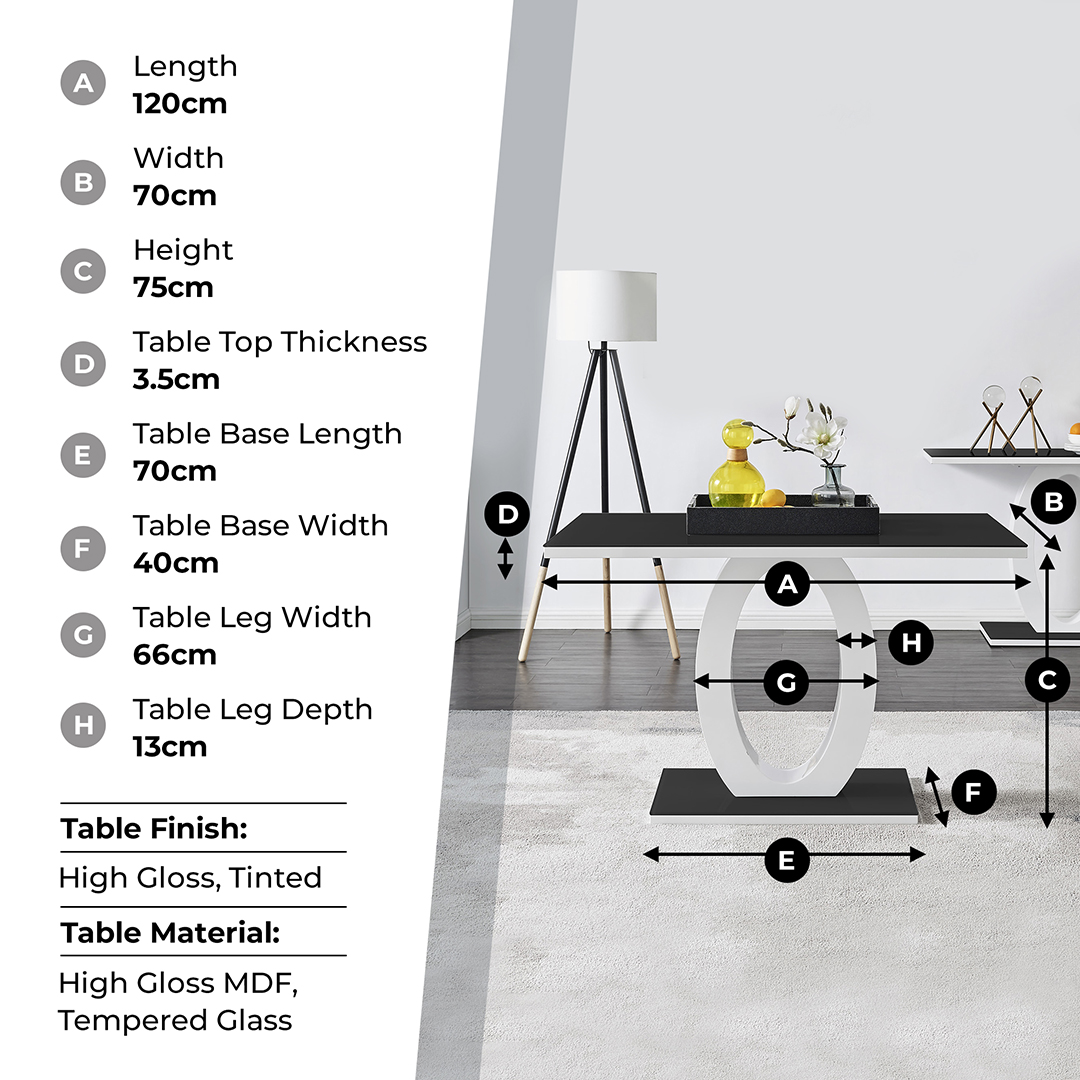 Width (cm) 70 Height (cm) 76 Depth (cm) 120 Feature 1 Modern high gloss/glass dining table Feature 2 Tinted black tempered glass Feature 3 Stylish high gloss halo support Feature 4 Sturdy frame Feature 5 Simple assembly Base Width 40 Table Primary Colour Black Table Secondary Colour White Table Material Glass Storage included? No ExtendingTable No Base Length (cm) 70 Base thickness (cm) 3 Surface Thickness (cm) 3.5 Max Seating Capacity 4 delivery_time Free next working day delivery available on orders before 8pm* delivery_pick_a_day Pick a delivery day to suit you delivery_door_to_door Door to door delivery. Delivery to flats cannot be taken up stairs or in lifts Table Weight Capacity (kg) 100 Finish High Gloss Product Weight (kg) 40.2 Assembly Details Self Assembly Additional Lead Time 0 Table Family Giovani Table Shape Rectangular merch_category Dining Tables Colour Black Material Glass PlopID 2759 -