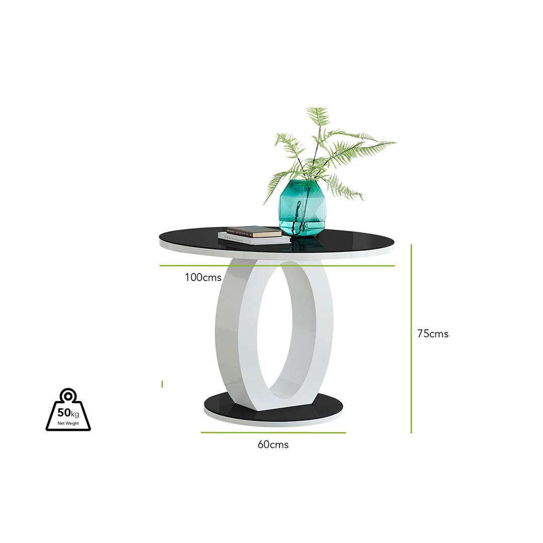 Width (cm) 100 Height (cm) 76 Depth (cm) 100 Feature 1 Beautifully crafted halo shaped support, making the table a stunning stand-out piece Feature 2 Tinted black tempered glass Feature 3 Stylish high gloss halo support Feature 4 Black toughened tempered glass top & base surface Feature 5 Available in 100x100cm and also 120x120cm with a choice of black and grey glass! Feature 6 Sturdy framework, which gives the table strong robust feel Feature 7 Stunning modern dining set Feature 8 Simple assembly Base Width 60 Table Primary Colour Black Table Secondary Colour White Table Material Glass Storage included? No ExtendingTable No Base Length (cm) 60 Base thickness (cm) 3 Surface Thickness (cm) 3.5 Max Seating Capacity 4 delivery_time Free next working day delivery available on orders before 8pm* delivery_pick_a_day Pick a delivery day to suit you delivery_door_to_door Door to door delivery. Delivery to flats cannot be taken up stairs or in lifts Table Weight Capacity (kg) 100 Finish High Gloss Product Weight (kg) 49.35 Assembly Details Self Assembly Additional Lead Time 0 Table Family Giovani Table Shape Round merch_category Dining Tables Colour Black Material Glass PlopID 2760 -