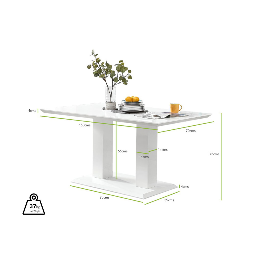 This Imperia dining table combines function, quality, and style without the high-end price tag. The classically elegant design is a real statement piece, evoking a strong and sturdy presence in your dining room. Its slick white gloss finish and high gloss surface is easy to wipe clean and reflects the light to produce a feeling of extra space in your dining area. But the unique pillared structure is what makes this table such an appealing design. Why? Because the structured simplicity complements a modern look while appearing sturdy and strong, much like more traditional furniture pieces. As the larger of our Imperia table models, this design gives the sense of a much grander scale. Generously offering a 150x90cm surface, the tabletop can comfortably fit six guests and accommodate much larger families. There's ample space for a banquet fit for royalty.