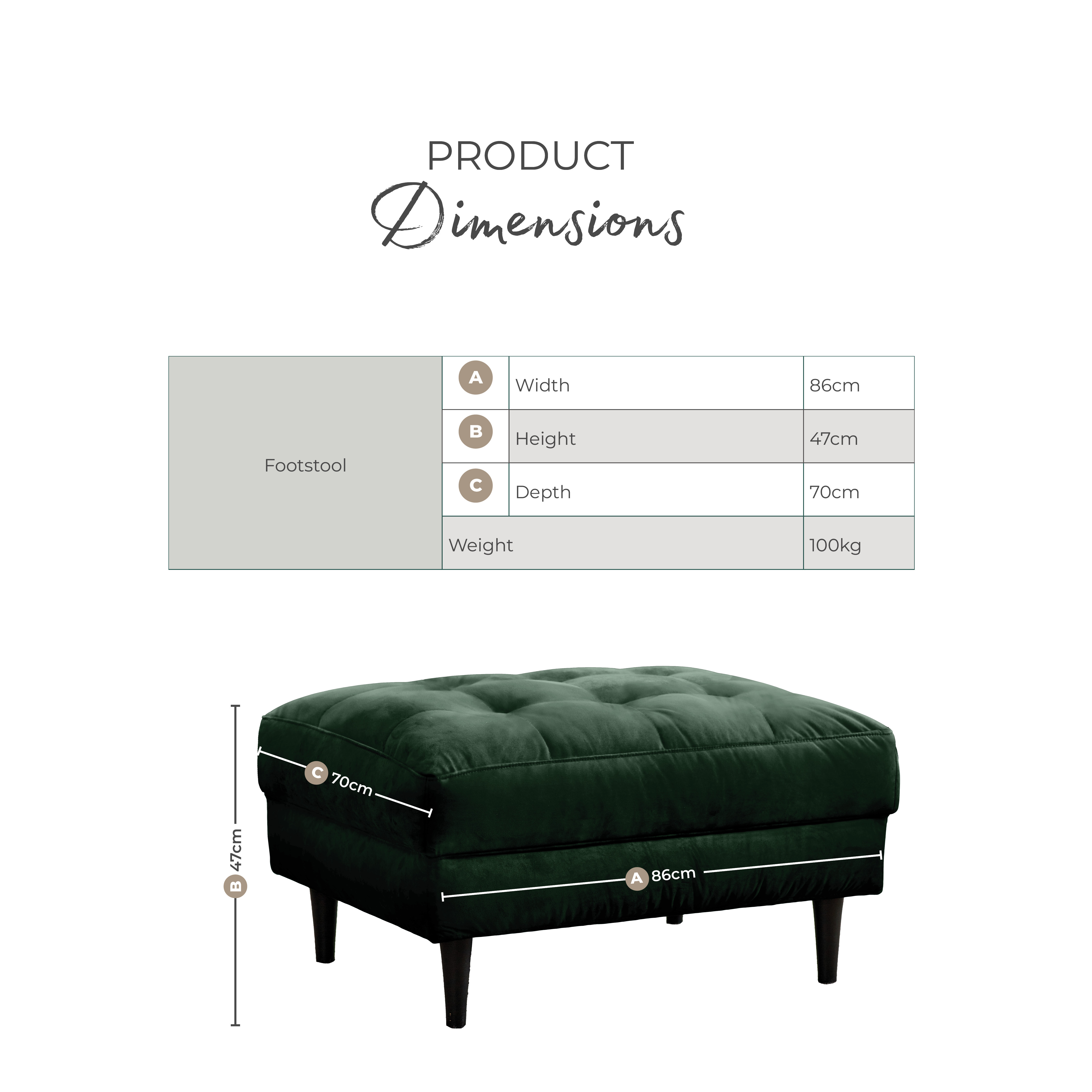 Constructed from a sturdy wood frame upholstered in soft-touch velvet that's easy to keep clean, and resting on strong tapered wooden legs. This piece is designed to last and look great while doing it! Matching 2 and 3 seater sofas available, and in a range of other colours. Note: This footstool will push up to the 3 Seater sofa to form a chaise. It does also match the 2 seater and is the same height, but won't quite line up with the seat cushions.