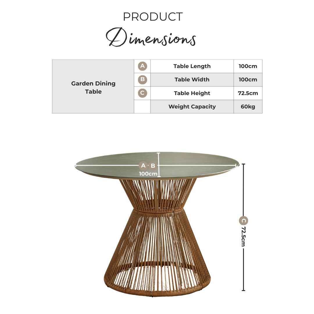 Width (cm) 100 Height (cm) 72 Depth (cm) 100 Sister SKUs LAN-OUT-TBL-BLK-4-ELBA Display Variant Yes Colour Beige Material Glass Finish Marble Feature 1 Garden dining set with round cream marble effect & rattan dining table and 4 cream metal & rattan dining chairs Feature 2 Stylish pinched pedestal leg on table, with woven rattan Feature 3 Stackable chairs for easy storage Feature 4 Simple yet stylish outdoor table and chairs for relaxed dining Feature 5 1 year warranty delivery_time Free next working day delivery available on orders before 8pm* delivery_pick_a_day Pick a delivery day to suit you delivery_door_to_door Door to door delivery. Delivery to flats cannot be taken up stairs or in lifts Chair Finish Powder Coated Chair Frame Material Metal Feet Material Plastic Chair Upholstery Material Fabric Water Resistant Cushion Yes Chair Cushion Colour Cream UV Resistant Yes Chair Frame Colour Beige Chair Depth (cm) 65 Chair Width (cm) 55 Chair Height (cm) 84 Chair Back Height (cm) 34 Seating Depth (cm) 44 Chair Weight (kg) 4 Seat Height (cm) 50 Arm Height (cm) 66 Seat Padding Thickness (cm) 3 Table Shape Round Table Colour Beige Table Material Metal Table Finish Marble Table Base Width (cm) 55 Table Surface Thickness (cm) 0.5 Table Type Dining table Number Of Seats 4 Table Height (cm) 72.5 Table Width (cm) 100 Table Length (cm) 100 Seat Weight Capacity PP (kg) 120 Table Weight Capacity (kg) 60 Product Weight (kg) 32 Assembly Details Assembly Required Intro Offer? No Date Listed 2026-02-02T00:00:00.000Z Swatch Colour Beige merch_category Garden Dining Sets _promo_message Save 20% on Garden Furniture With Code: EARLY20 custom_badge #914e3b|#ffffff|20% off with code -