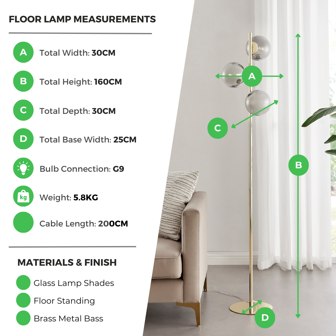 Width (cm) 30 Height (cm) 160 Depth (cm) 30 Colour Gold Finish Brushed Metal Feature 1 Tree floor lamp with 3 separate lights Feature 2 Perfect standing lamp for living rooms, bedrooms, desks or any shady corners Feature 3 Simple brass stand with 3 smoked glass globe shades Feature 4 Modern lighting with vintage retro design inspiration Feature 5 2 year warranty Light Diameter (cm) 30 Light Dimmable (cm) No Maximum Fitting Watt 3w Light Socket Power Rating IP20 Bulbs Included No Bulb Cap Fitting G9 delivery_time Free next working day delivery available delivery_pick_a_day Pick a delivery day to suit you delivery_door_to_door Door to door delivery. Delivery to flats cannot be taken up stairs or in lifts Light Shade Colour Grey Light Stand Colour Brass Product Weight (kg) 3.6 Additional Lead Time 0 merch_category Lighting Light Fixture Type Floor Lamp Material Glass Display Variant Yes -