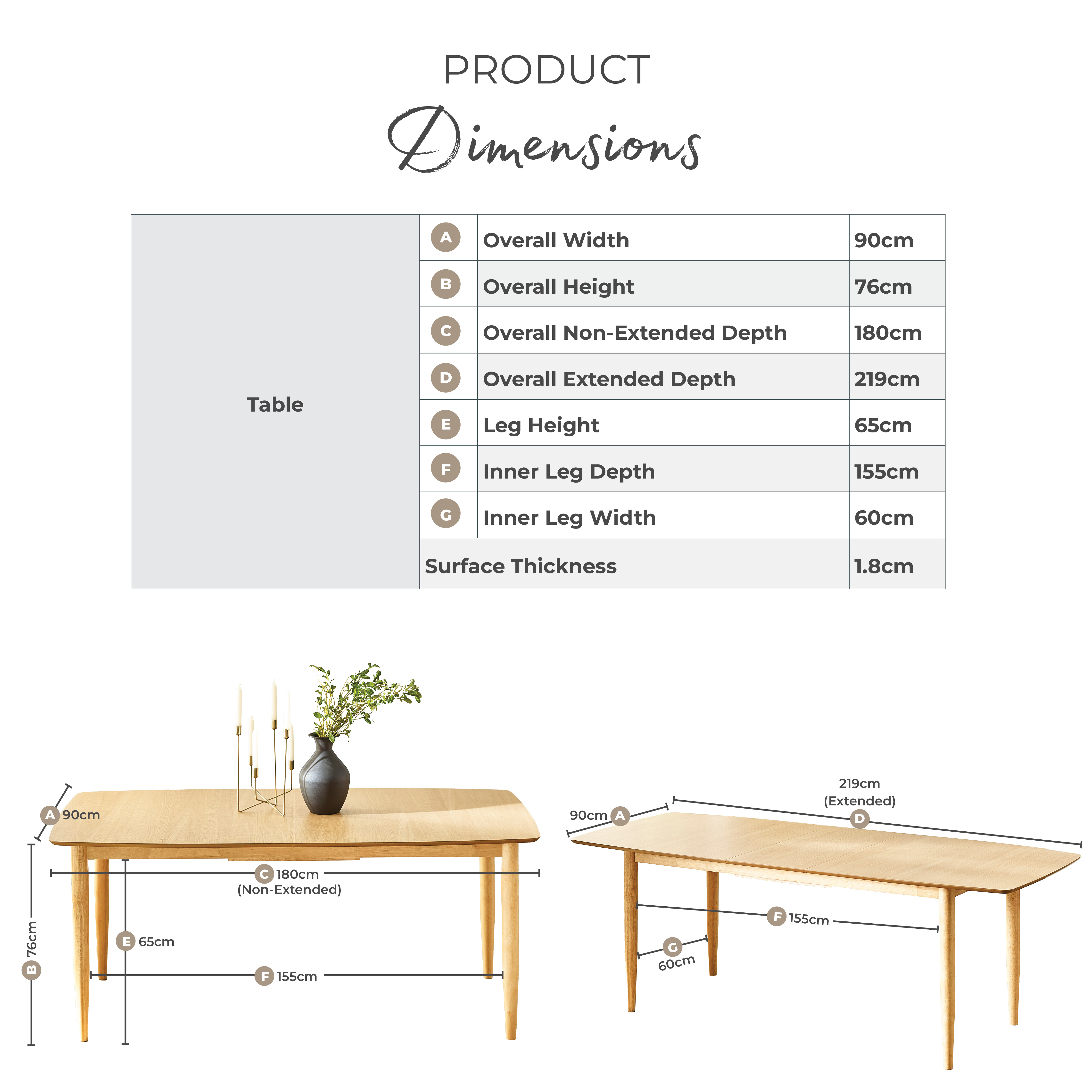 Width (cm) 90 Height (cm) 76 Depth (cm) 219 Table Family Leif Table Primary Colour Oak Table Material Rubberwood Surface Thickness (cm) 1.8 Max Seating Capacity 4 Extending Length 39 Number of seats with extension 6 ExtendingTable Yes Table Shape Rectangular Leif Oak Effect Wooden Rectangular Extending Table & 6 Masa Oak Dining Chairs