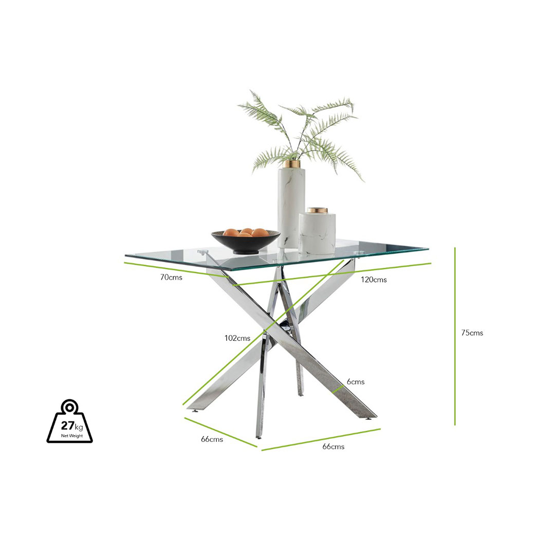 Width (cm) 70 Height (cm) 75 Depth (cm) 120 Table Primary Colour Clear Table Secondary Colour Black Table Material Tempered Glass Storage included? No ExtendingTable No Surface Thickness (cm) 1 Max Seating Capacity 4 Table Weight Capacity (kg) 100 Table Family Leonardo Table Shape Rectangular Leonardo Black Leg Glass Dining Table & 4 Belgravia Black Leg Chairs