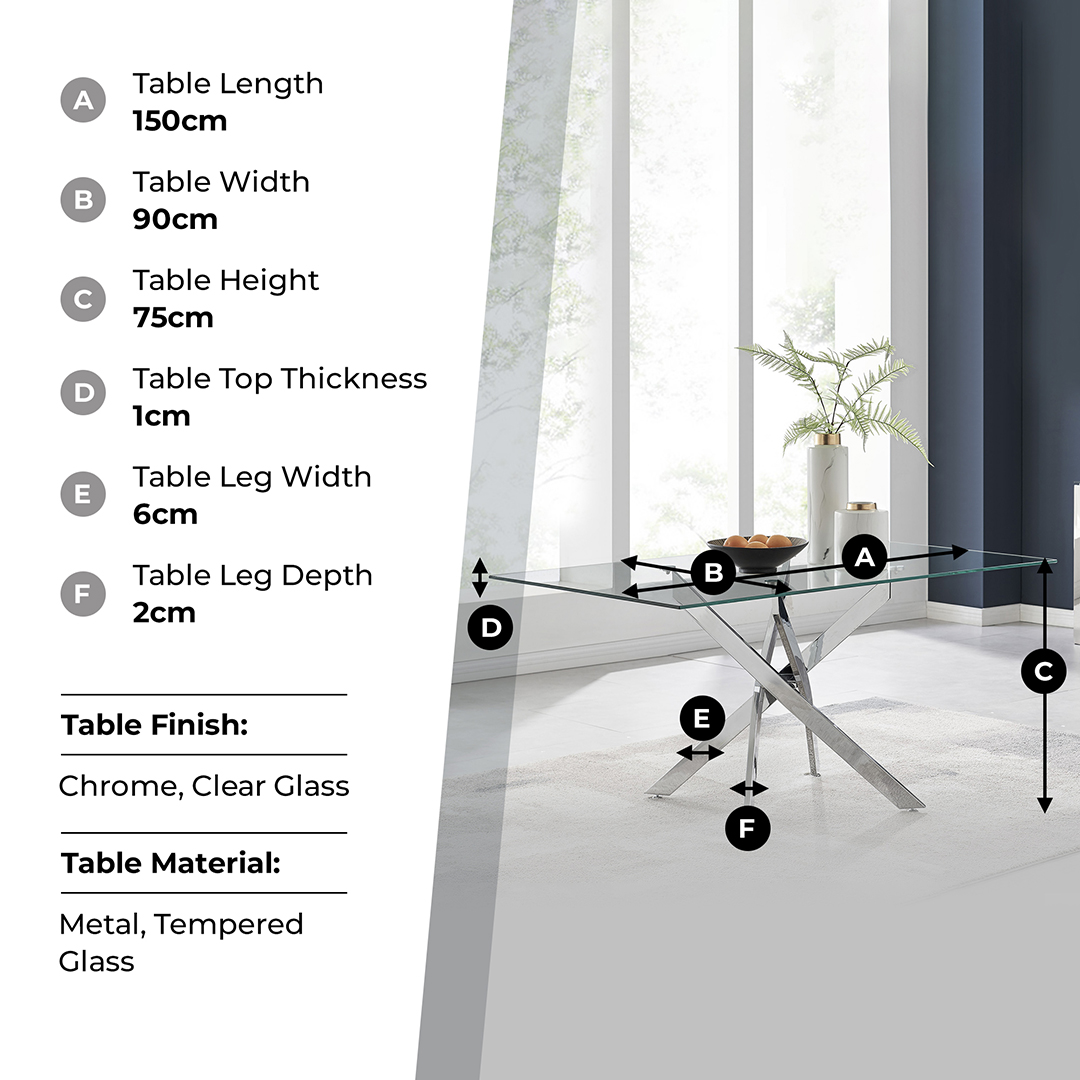 Width (cm) 90 Height (cm) 75 Depth (cm) 150 Table Primary Colour Clear Table Secondary Colour Silver Table Material Glass Storage included? No ExtendingTable No Surface Thickness (cm) 1 Max Seating Capacity 6 Table Weight Capacity (kg) 100 Table Family Leonardo Table Shape Rectangular Leonardo Glass and Chrome Dining Table & 6 Falun Silver Leg Chairs
