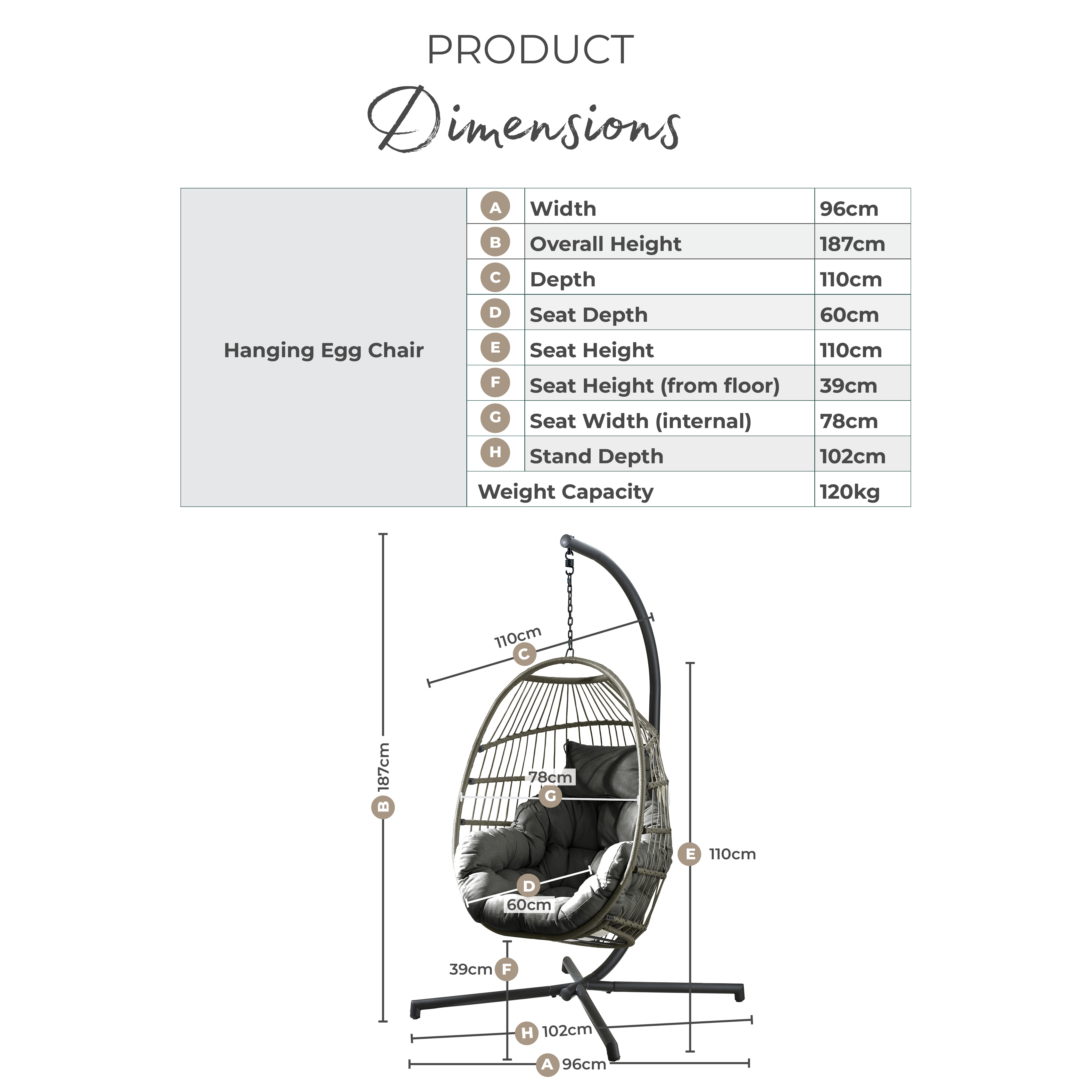 Width (cm) 82 Height (cm) 187 Depth (cm) 110 Colour Beige Material Rattan Finish Rattan Feature 1 Hanging rattan swing egg chair for gardens, patios and balconies Feature 2 Textured beige PE rattan and black metal hanging frame Feature 3 Thick cream cushions Feature 4 UV and weather resistant chair frame, splash-proof cushions Feature 5 Includes a FREE water resistant cover + 2 year warranty delivery_time Free next working day delivery available on orders before 8pm* delivery_pick_a_day Pick a delivery day to suit you delivery_door_to_door Door to door delivery. Delivery to flats cannot be taken up stairs or in lifts Chair Finish Rattan Chair Frame Material Metal Feet Material Plastic Chair Upholstery Material Fabric Rattan Type Poly Rattan Water Resistant Cushion Yes Chair Cushion Colour Cream UV Resistant Yes Chair Frame Colour Black Chair Depth (cm) 60 Chair Width (cm) 82 Chair Height (cm) 107 Chair Back Height (cm) 107 Seating Depth (cm) 60 Chair Weight (kg) 24.4 Seat Height (cm) 61 Seat Padding Thickness (cm) 10 Back Padding Thickness (cm) 10 Number Of Seats 1 Seat Weight Capacity PP (kg) 120 Product Weight (kg) 24.4 Assembly Details Assembly Required Additional Lead Time 0 Date Listed 2025-02-27T00:00:00.000Z merch_category Garden Egg Chairs _promo_message Garden Sale Now On | Free Next Day Delivery Swatch Colour Natural Sister SKUs EGG-OUT-HNG-CHR-GRN,EGG-OUT-HNG-CHR-GRY,EGG-OUT-HNG-CHR-TER merch_rank 1314 Display Variant Yes USP Feature 1 Free Protective Cover Included USP Feature 1 Description Waterproof outdoor cover included at no extra cost to help protect your furniture from rain, dirt and debris when not in use. USP Feature 2 All-Season Outdoor Durability USP Feature 2 Description Built from materials designed to withstand the changing weather conditions. USP Feature 3 Deep-Filled Supportive Cushions USP Feature 3 Description Generously padded cushions designed for lasting comfort during extended use. USP Feature 4 Splash-Proof Cushions USP Feature 4 Description Cushion covers help repel moisture and are quick drying after light rain. USP Feature 5 UV-Resistant Materials USP Feature 5 Description Designed to help prevent fading and sun damage, maintaining colour and appearance over time. USP Feature 6 Indoor Outdoor Compatible USP Feature 6 Description Suitable for both indoor and outdoor use, offering flexible styling all year round. Collection Egg USP Feature 1 Image https://s3-eu-west-1.amazonaws.com/cdn.production.aws.eu-w1.pimberly.com/public/asset/raw/5fbbce1a2fd14f001bd75232/23a93167/69bc217804511b42cc00014d/EGG-OUT-HNG-CHR-NAT_USP1.jpg USP Feature 2 Image https://s3-eu-west-1.amazonaws.com/cdn.production.aws.eu-w1.pimberly.com/public/asset/raw/5fbbce1a2fd14f001bd75232/23a93167/69bc217804511b42cc00014e/EGG-OUT-HNG-CHR-NAT_USP2.jpg USP Feature 3 Image https://s3-eu-west-1.amazonaws.com/cdn.production.aws.eu-w1.pimberly.com/public/asset/raw/5fbbce1a2fd14f001bd75232/23a93167/69bc217804511b42cc00014f/EGG-OUT-HNG-CHR-NAT_USP3.jpg USP Feature 4 Image https://s3-eu-west-1.amazonaws.com/cdn.production.aws.eu-w1.pimberly.com/public/asset/raw/5fbbce1a2fd14f001bd75232/23a93167/69bc217804511b42cc000150/EGG-OUT-HNG-CHR-NAT_USP4.jpg USP Feature 6 Image https://s3-eu-west-1.amazonaws.com/cdn.production.aws.eu-w1.pimberly.com/public/asset/raw/5fbbce1a2fd14f001bd75232/23a93167/69bc217804511b42cc000152/EGG-OUT-HNG-CHR-NAT_USP6.jpg -