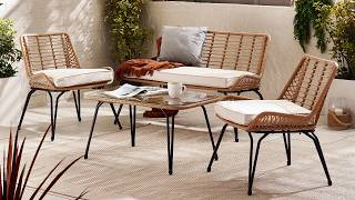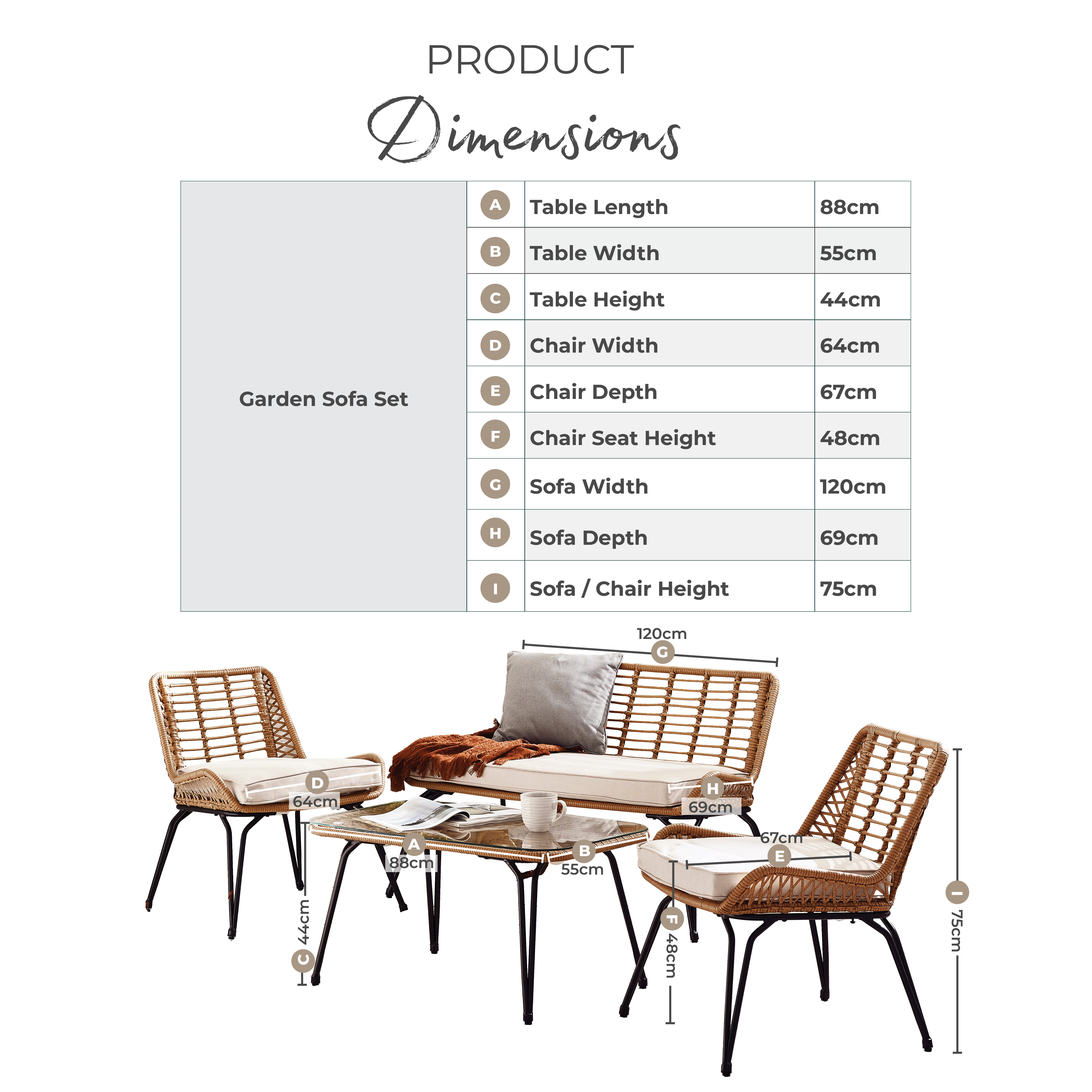 Width (cm) 120 Height (cm) 74 Depth (cm) 69 Colour Beige Feature 1 Beige rattan garden furniture set - 2 seat sofa, 2 chairs, coffee table Feature 2 Modern boho industrial design with natural brown wicker-effect & tapered black legs Feature 3 Weather-resistant PE rattan on steel frame Feature 4 Soft padded 'greige' - greyish beige - cushions are splash-proof Feature 5 Includes a FREE water resistant cover Chair Finish Rattan Chair Frame Material Metal Feet Material Plastic Chair Upholstery Material Fabric Rattan Type Poly Rattan Water Resistant Cushion Yes Chair Cushion Colour Cream UV Resistant Yes Chair Frame Colour Beige Chair Depth (cm) 67 Chair Width (cm) 64 Chair Height (cm) 75 Chair Back Height (cm) 34 Seating Depth (cm) 50 Chair Weight (kg) 6.3 Seat Height (cm) 48 Arm Height (cm) 51 Seat Padding Thickness (cm) 8 Table Shape Rectangular Table Colour Beige Table Material Rattan Table Base Width (cm) 55 Table Surface Thickness (cm) 0.5 Table Type Coffee table Number Of Seats 4 Table Height (cm) 44 Table Width (cm) 55 Table Length (cm) 88 Seat Weight Capacity PP (kg) 120 Table Weight Capacity (kg) 35 delivery_time Free next working day delivery available on orders before 8pm* delivery_pick_a_day Pick a delivery day to suit you delivery_door_to_door Door to door delivery. Delivery to flats cannot be taken up stairs or in lifts Product_Stock_Type stocked Product Weight (kg) 32 Assembly Details Assembly Required Material Rattan Additional Lead Time 0 merch_category Garden Sofa Sets Finish Rattan _promo_message Garden Sale Now On | Free Next Day Delivery Sister SKUs LIS-OUT-SOF-4-GRY Display Variant Yes Swatch Colour Beige Table Finish Rattan merch_rank 1311 USP Feature 1 Free Protective Cover Included USP Feature 1 Description Waterproof outdoor cover included at no extra cost to help protect your furniture from rain, dirt and debris when not in use. USP Feature 2 All-Season Outdoor Durability USP Feature 2 Description Built from materials designed to withstand the changing weather conditions. USP Feature 3 Hand-Woven PE Rattan Finish USP Feature 3 Description Synthetic rattan woven for strength and durability, offering the look of natural wicker without the maintenance. USP Feature 4 Splash-Proof Cushions USP Feature 4 Description Cushion covers help repel moisture and are quick drying after light rain. USP Feature 5 UV-Resistant Materials USP Feature 5 Description Designed to help prevent fading and sun damage, maintaining colour and appearance over time. USP Feature 6 Tempered Safety Glass Top USP Feature 6 Description Safety-tested tempered glass surface offers enhanced strength and easy cleaning. Collection Lisbon USP Feature 2 Image https://s3-eu-west-1.amazonaws.com/cdn.production.aws.eu-w1.pimberly.com/public/asset/raw/5fbbce1a2fd14f001bd75232/23a93167/69bc217804511b42cc0001ba/LIS-OUT-SOF-4-BRN_USP2.jpg USP Feature 3 Image https://s3-eu-west-1.amazonaws.com/cdn.production.aws.eu-w1.pimberly.com/public/asset/raw/5fbbce1a2fd14f001bd75232/23a93167/69bc217804511b42cc0001bb/LIS-OUT-SOF-4-BRN_USP3.jpg USP Feature 4 Image https://s3-eu-west-1.amazonaws.com/cdn.production.aws.eu-w1.pimberly.com/public/asset/raw/5fbbce1a2fd14f001bd75232/23a93167/69bc217804511b42cc0001bc/LIS-OUT-SOF-4-BRN_USP4.jpg USP Feature 6 Image https://s3-eu-west-1.amazonaws.com/cdn.production.aws.eu-w1.pimberly.com/public/asset/raw/5fbbce1a2fd14f001bd75232/23a93167/69bc217804511b42cc0001be/LIS-OUT-SOF-4-BRN_USP6.jpg -
