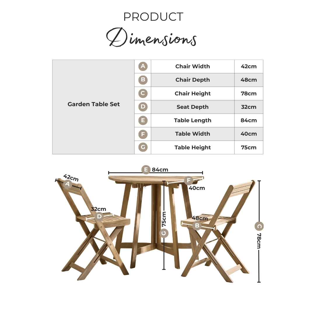 Width (cm) 84 Height (cm) 78 Depth (cm) 40 Colour Natural Material Wood Finish Natural Feature 1 Solid FSC® certified acacia wood outdoor dining set in teak stain colour Feature 2 Features drop leaf half round folding outdoor table Feature 3 Includes 2 matching folding wooden chairs Feature 4 No assembly required Feature 5 Comes fully assembled and with 1 year warranty delivery_time Free next working day delivery available on orders before 8pm* delivery_pick_a_day Pick a delivery day to suit you delivery_door_to_door Door to door delivery. Delivery to flats cannot be taken up stairs or in lifts Chair Finish Natural Chair Frame Material Wood UV Resistant Yes Chair Frame Colour Natural Chair Depth (cm) 48 Chair Width (cm) 42 Chair Height (cm) 78 Chair Back Height (cm) 32.5 Seating Depth (cm) 32 Chair Weight (kg) 6 Seat Height (cm) 45.5 Table Shape Half Circle Table Colour Natural Table Material Wood Table Finish Natural Table Surface Thickness (cm) 2 Table Type Dining table Number Of Seats 2 Table Height (cm) 75 Table Width (cm) 40 Table Length (cm) 84 Seat Weight Capacity PP (kg) 110 Table Weight Capacity (kg) 50 Product Weight (kg) 13.5 Assembly Details Assembly Required Date Listed 2025-01-28T00:00:00.000Z Additional Lead Time 0 merch_category Garden Bistro Sets _promo_message Save 20% on Garden Furniture With Code: EARLY20 custom_badge #914e3b|#ffffff|20% off with code Display Variant Yes Swatch Colour Wood Water Resistant Cushion Yes Table Base Width (cm) 40 merch_rank 1014 -