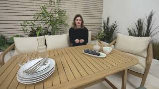 Width (cm) 140 Height (cm) 65 Depth (cm) 80 Display Variant Yes Colour Natural Material Wood Finish Natural Feature 1 8 seat wooden garden sofa dining set in solid acacia wood with light teak colour stain Feature 2 Includes 3 seat garden sofa, 3 seat garden bench, 2 armchairs and outdoor dining table Feature 3 Sleek contemporary look with retro mid-century-modern touches Feature 4 Plump beige fabric cushions Feature 5 1 year warranty delivery_time Free next working day delivery available on orders before 8pm* delivery_pick_a_day Pick a delivery day to suit you delivery_door_to_door Door to door delivery. Delivery to flats cannot be taken up stairs or in lifts Chair Finish Natural Chair Frame Material Wood Feet Material Plastic Chair Upholstery Material Fabric Water Resistant Cushion Yes Chair Cushion Colour Cream UV Resistant Yes Chair Frame Colour Natural Chair Depth (cm) 46.5 Chair Width (cm) 46.5 Chair Height (cm) 45 Chair Back Height (cm) 37 Seating Depth (cm) 46.5 Chair Weight (kg) 11.5 Seat Height (cm) 45 Seat Padding Thickness (cm) 13 Table Shape Rectangular Table Colour Natural Table Material Wood Table Finish Natural Table Base Width (cm) 80 Table Surface Thickness (cm) 1 Table Type Dining table Number Of Seats 8 Table Height (cm) 65 Table Width (cm) 80 Table Length (cm) 140 Seat Weight Capacity PP (kg) 110 Table Weight Capacity (kg) 50 Product Weight (kg) 74.5 Assembly Details Assembly Required Intro Offer? No Date Listed 2026-02-02T00:00:00.000Z Swatch Colour Wood merch_category Garden Dining Sets _promo_message Save 20% on Garden Furniture With Code: EARLY20 custom_badge #914e3b|#ffffff|20% off with code Back Padding Thickness (cm) 23 -