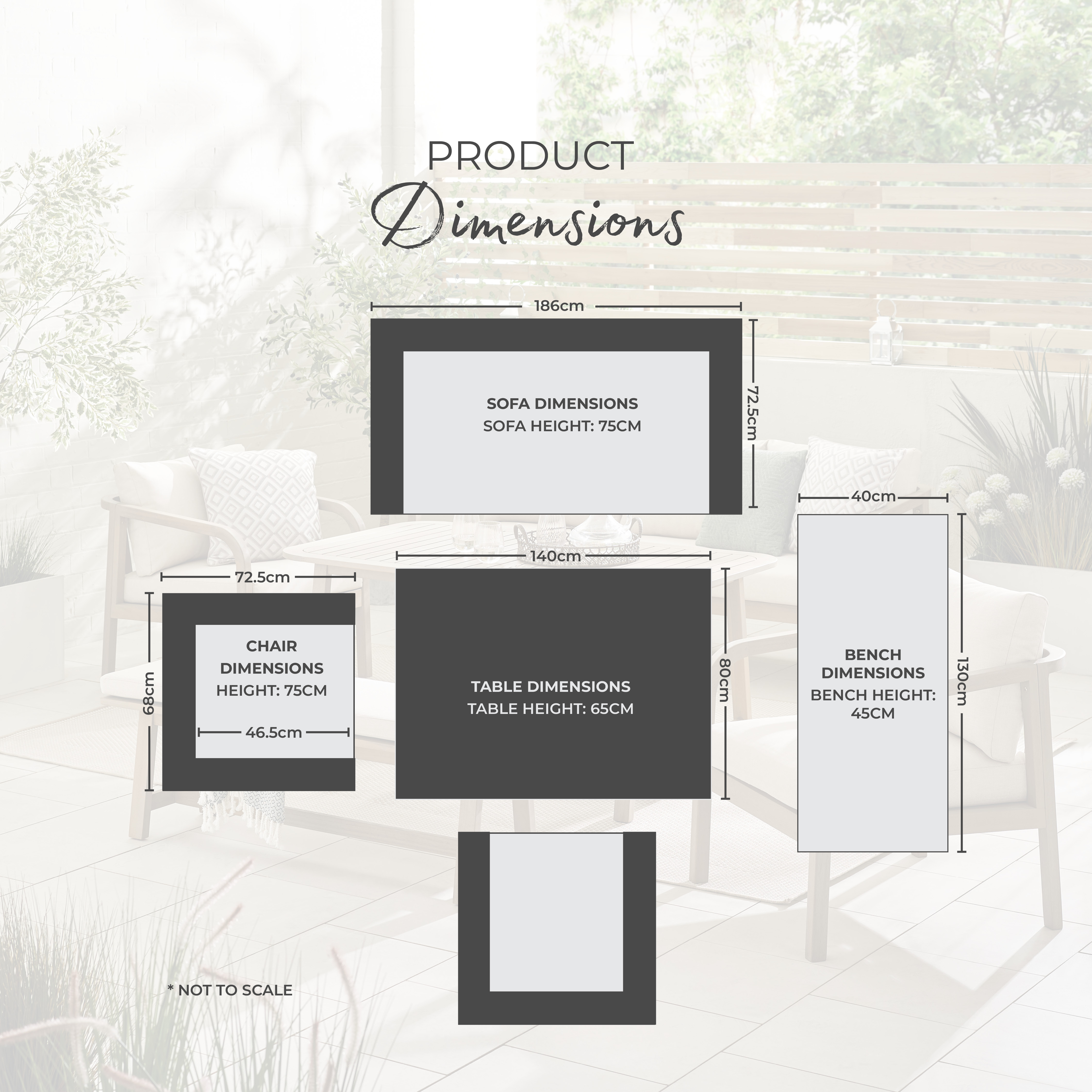 - Includes 3 seat garden sofa, 3 seat garden bench, 2 armchairs and outdoor dining table