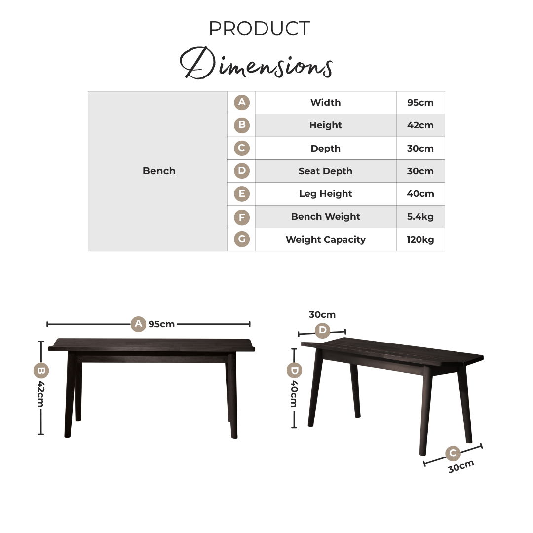 Width (cm) 30 Height (cm) 42 Depth (cm) 95 Sister SKUs LYNT-DIN-BEN-SML-WHT-LGRY,LYNT-DIN-BEN-SML-OAK,LYNT-DIN-BEN-SML-WAL Colour Black Material Wood Finish Wood Seat Height (cm) 42 Feature 1 Small solid black wooden dining bench Feature 2 Solid rubberwood with black stain Feature 3 Modern take on more retro classic furniture styles Feature 4 Easy to follow instructions for self-assembly Feature 5 2 year warranty Chair Seat Colour Black Chair Leg Colour Black Chair Seat Material Rubberwood Chair Leg Material Wood Chair Leg Height (cm) 40 Chair Padding Thickness (cm) 2 Chair Width (cm) 30 Chair Height (cm) 42 delivery_time Free next working day delivery available on orders before 8pm* delivery_pick_a_day Pick a delivery day to suit you delivery_door_to_door Door to door delivery. Delivery to flats cannot be taken up stairs or in lifts Seat Weight Capacity (kg) 120 Product Weight (kg) 5.4 Additional Lead Time 0 Weight Capacity 120 Intro Offer? No Date Listed 2025-12-19T00:00:00.000Z Swatch Colour Black merch_category Dining Chairs _promo_message Free Next Day Delivery, Order by 8pm Assembly Details Assembly Required merch_rank 794 Display Variant Yes Collection Lynton USP Feature 1 Sustainably Sourced and Eco-Friendly USP Feature 1 Description Repurposing rubber trees that have completed their latex cycle, Rubberwood is a fantastic sustainable choice of hard wood. USP Feature 2 Solid & Durable Wood USP Feature 2 Description Rubberwood features minimal shrinkage or warping, thanks to dense grain and effective kiln-drying and chemical treatment processes. USP Feature 3 Modern Tapered Leg Design USP Feature 3 Description Slim, angled legs provide a clean, stylish silhouette while keeping the set sturdy for everyday dining. USP Feature 4 Versatile Finish USP Feature 4 Description Takes stains and paints well, so whether you love a natural wood look or a coloured finish, it always looks great and allows room for upcycling in future. USP Feature 5 Free Next Day Delivery USP Feature 5 Description Order by 8pm for Free Next Day Delivery across mainland UK* USP Feature 6 Free 30 Day Returns USP Feature 6 Description Changed your mind? Return for free within 30 days- no hassle, no stress. -