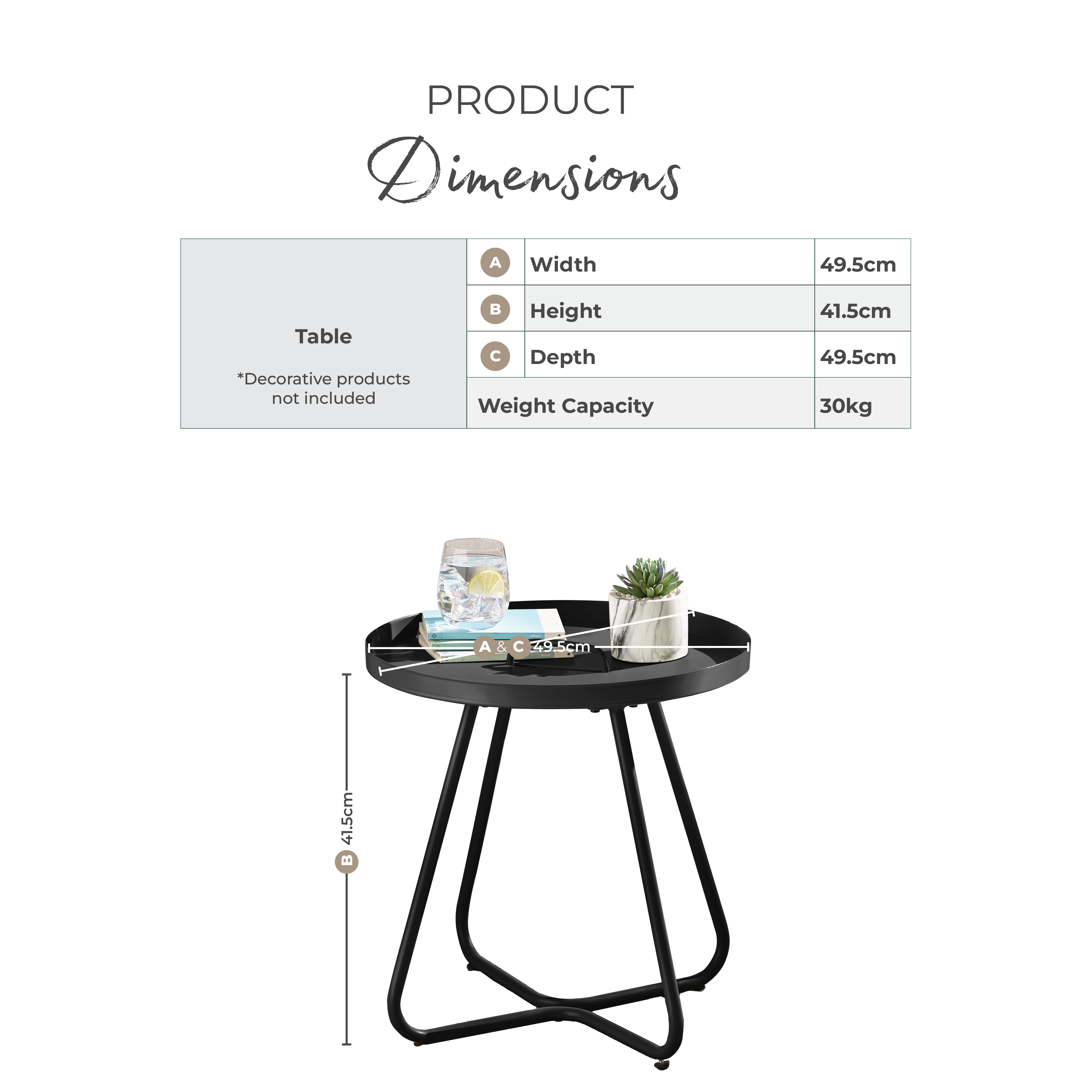 Width (cm) 49 Height (cm) 41 Depth (cm) 49 Colour Black Material Metal Finish Powder Coated Feature 1 Black metal round side table Feature 2 Suitable for indoor or outdoor use Feature 3 Industrial style handle detail to centre Feature 4 Sturdy black powder-coated metal for UV and weather resistance Feature 5 1 year warranty delivery_time Free next working day delivery available on orders before 8pm* delivery_pick_a_day Pick a delivery day to suit you delivery_door_to_door Door to door delivery. Delivery to flats cannot be taken up stairs or in lifts Feet Material Plastic UV Resistant Yes Table Shape Round Table Colour Black Table Material Metal Table Finish Powder Coated Table Base Width (cm) 49.5 Table Type Side Table Table Height (cm) 41.5 Table Width (cm) 49.5 Table Length (cm) 49.5 Table Weight Capacity (kg) 30 Product Weight (kg) 3.4 Assembly Details Assembly Required Additional Lead Time 0 Date Listed 2025-02-27T00:00:00.000Z merch_category Garden Side Tables _promo_message Save 20% on Garden Furniture With Code: EARLY20 custom_badge #914e3b|#ffffff|20% off with code Sister SKUs LYON-OUT-SID-TBL-CRM,LYON-OUT-SID-TBL-GRN Swatch Colour Black Water Resistant Cushion No Table Surface Thickness (cm) 3 merch_rank 743 -