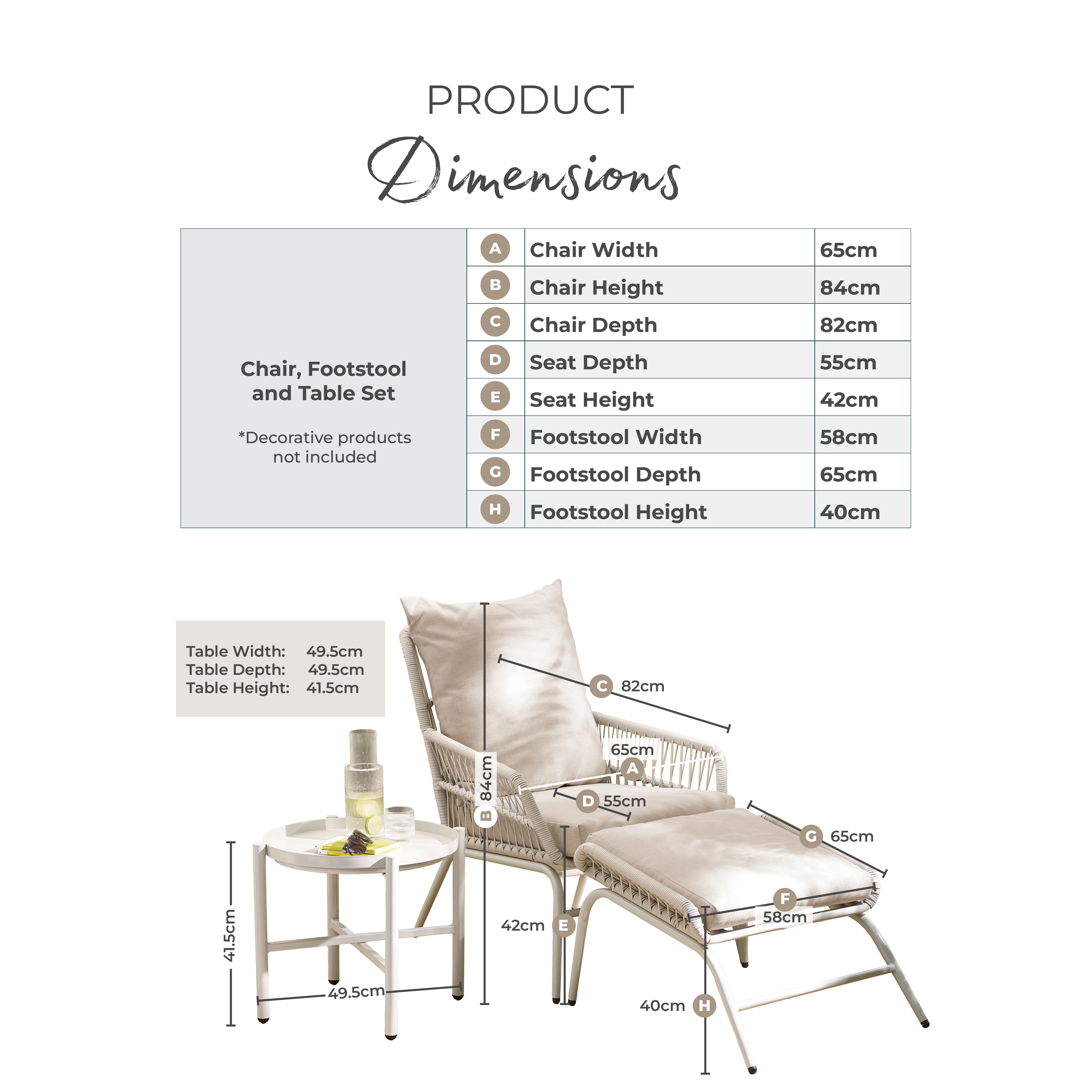 Width (cm) 65 Height (cm) 84 Depth (cm) 77 Colour Cream Material Metal Finish Powder Coated Feature 1 Cream metal and PE rattan outdoor garden chair with footstool and round side table Feature 2 Plump cream cushions Feature 3 Simple design will suit a range of home and garden styles Feature 4 UV and weather resistant table and chair frames, splash-proof cushions Feature 5 Includes a FREE water resistant cover + 2 year warranty delivery_time Free next working day delivery available on orders before 8pm* delivery_pick_a_day Pick a delivery day to suit you delivery_door_to_door Door to door delivery. Delivery to flats cannot be taken up stairs or in lifts Chair Finish Powder Coated Chair Frame Material Metal Feet Material Plastic Chair Upholstery Material Fabric Water Resistant Cushion Yes Chair Cushion Colour Cream UV Resistant Yes Chair Frame Colour Cream Chair Depth (cm) 82 Chair Width (cm) 65 Chair Height (cm) 84 Chair Back Height (cm) 58 Seating Depth (cm) 55 Chair Weight (kg) 8.8 Seat Height (cm) 42 Seat Padding Thickness (cm) 8 Table Shape Round Table Colour Cream Table Material Metal Table Finish Powder Coated Table Base Width (cm) 49.5 Table Type Side Table Number Of Seats 1 Table Height (cm) 41.5 Table Width (cm) 49.5 Table Length (cm) 49.5 Seat Weight Capacity PP (kg) 120 Table Weight Capacity (kg) 30 Product Weight (kg) 18 Assembly Details Assembly Required Additional Lead Time 0 Date Listed 2025-02-27T00:00:00.000Z merch_category Garden Chairs _promo_message Garden Sale Now On | Free Next Day Delivery Sister SKUs LYON-OUT-CHR-SET-GRN Swatch Colour Cream Table Surface Thickness (cm) 3 Arm Height (cm) 54 merch_rank 2100 USP Feature 1 Free Protective Cover Included USP Feature 1 Description Waterproof outdoor cover included at no extra cost to help protect your furniture from rain, dirt and debris when not in use. USP Feature 2 All-Season Outdoor Durability USP Feature 2 Description Built from materials designed to withstand the changing weather conditions. USP Feature 3 Hand-Woven PE Rattan Finish USP Feature 3 Description Synthetic rattan woven for strength and durability, offering the look of natural wicker without the maintenance. USP Feature 4 Splash-Proof Cushions USP Feature 4 Description Cushion covers help repel moisture and are quick drying after light rain. USP Feature 5 UV-Resistant Materials USP Feature 5 Description Designed to help prevent fading and sun damage, maintaining colour and appearance over time. USP Feature 6 Indoor Outdoor Compatible USP Feature 6 Description Suitable for both indoor and outdoor use, offering flexible styling all year round. Collection Lyon USP Feature 2 Image https://s3-eu-west-1.amazonaws.com/cdn.production.aws.eu-w1.pimberly.com/public/asset/raw/5fbbce1a2fd14f001bd75232/23a93167/69bc217804511b42cc0001c6/LYON-OUT-CHR-SET-CRM_USP2.jpg USP Feature 3 Image https://s3-eu-west-1.amazonaws.com/cdn.production.aws.eu-w1.pimberly.com/public/asset/raw/5fbbce1a2fd14f001bd75232/23a93167/69bc217804511b42cc0001c7/LYON-OUT-CHR-SET-CRM_USP3.jpg USP Feature 4 Image https://s3-eu-west-1.amazonaws.com/cdn.production.aws.eu-w1.pimberly.com/public/asset/raw/5fbbce1a2fd14f001bd75232/23a93167/69bc217804511b42cc0001c8/LYON-OUT-CHR-SET-CRM_USP4.jpg USP Feature 6 Image https://s3-eu-west-1.amazonaws.com/cdn.production.aws.eu-w1.pimberly.com/public/asset/raw/5fbbce1a2fd14f001bd75232/23a93167/69bc217804511b42cc0001ca/LYON-OUT-CHR-SET-CRM_USP6.jpg -