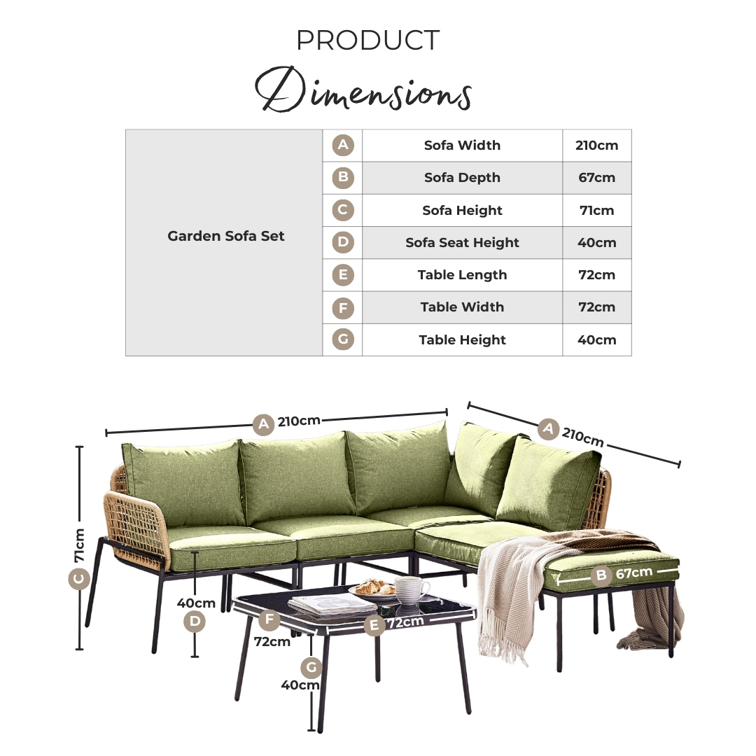 Width (cm) 210 Height (cm) 71 Depth (cm) 67 Colour Beige Feature 1 Black metal and beige rattan 5 seat corner sofa with coffee table Feature 2 Modern boho industrial look with tapered black steel legs Feature 3 UV and weather resistant sofa frame and table Feature 4 Soft padded taupe cushions are splash-proof Feature 5 Includes a FREE water resistant cover delivery_time Free next working day delivery available on orders before 8pm* delivery_pick_a_day Pick a delivery day to suit you delivery_door_to_door Door to door delivery. Delivery to flats cannot be taken up stairs or in lifts Chair Finish Powder Coated Chair Frame Material Metal Feet Material Plastic Chair Upholstery Material Fabric Rattan Type Poly Rattan Water Resistant Cushion Yes Chair Cushion Colour Cream UV Resistant Yes Chair Frame Colour Grey Chair Depth (cm) 67 Chair Width (cm) 67 Chair Height (cm) 71 Chair Back Height (cm) 70 Seating Depth (cm) 58 Chair Weight (kg) 7.5 Seat Height (cm) 40 Arm Height (cm) 61 Seat Padding Thickness (cm) 8 Table Shape Square Table Colour Black Table Material Metal Table Base Width (cm) 72 Table Surface Thickness (cm) 0.5 Table Type Coffee table Number Of Seats 6 Table Height (cm) 40 Table Width (cm) 72 Table Length (cm) 72 Seat Weight Capacity PP (kg) 120 Table Weight Capacity (kg) 35 Product Weight (kg) 43.7 Assembly Details Assembly Required Additional Lead Time 0 merch_category Garden Sofa Sets Material Metal Finish Powder Coated _promo_message Garden Sale Now On | Free Next Day Delivery Sister SKUs MAL-OUT-SOF-6-GRY,MAL-OUT-SOF-6-NAT-GRN Display Variant Yes Swatch Colour Beige Table Finish Powder Coated merch_rank 750 USP Feature 1 Free Protective Cover Included USP Feature 1 Description Waterproof outdoor cover included at no extra cost to help protect your furniture from rain, dirt and debris when not in use. USP Feature 2 All-Season Outdoor Durability USP Feature 2 Description Built from materials designed to withstand the changing weather conditions. USP Feature 3 Hand-Woven PE Rattan Finish USP Feature 3 Description Synthetic rattan woven for strength and durability, offering the look of natural wicker without the maintenance. USP Feature 4 Splash-Proof Cushions USP Feature 4 Description Cushion covers help repel moisture and are quick drying after light rain. USP Feature 5 UV-Resistant Materials USP Feature 5 Description Designed to help prevent fading and sun damage, maintaining colour and appearance over time. USP Feature 6 Flexible Modular Configuration USP Feature 6 Description Adaptable layout allows you to arrange seating to suit your space. Collection Maldives USP Feature 1 Image https://s3-eu-west-1.amazonaws.com/cdn.production.aws.eu-w1.pimberly.com/public/asset/raw/5fbbce1a2fd14f001bd75232/23a93167/69bc217804511b42cc0001e9/MAL-OUT-SOF-6-NAT_USP1.jpg USP Feature 2 Image https://s3-eu-west-1.amazonaws.com/cdn.production.aws.eu-w1.pimberly.com/public/asset/raw/5fbbce1a2fd14f001bd75232/23a93167/69bc217804511b42cc0001ea/MAL-OUT-SOF-6-NAT_USP2.jpg USP Feature 3 Image https://s3-eu-west-1.amazonaws.com/cdn.production.aws.eu-w1.pimberly.com/public/asset/raw/5fbbce1a2fd14f001bd75232/23a93167/69bc217804511b42cc0001eb/MAL-OUT-SOF-6-NAT_USP3.jpg USP Feature 4 Image https://s3-eu-west-1.amazonaws.com/cdn.production.aws.eu-w1.pimberly.com/public/asset/raw/5fbbce1a2fd14f001bd75232/23a93167/69bc217804511b42cc0001ec/MAL-OUT-SOF-6-NAT_USP4.jpg -