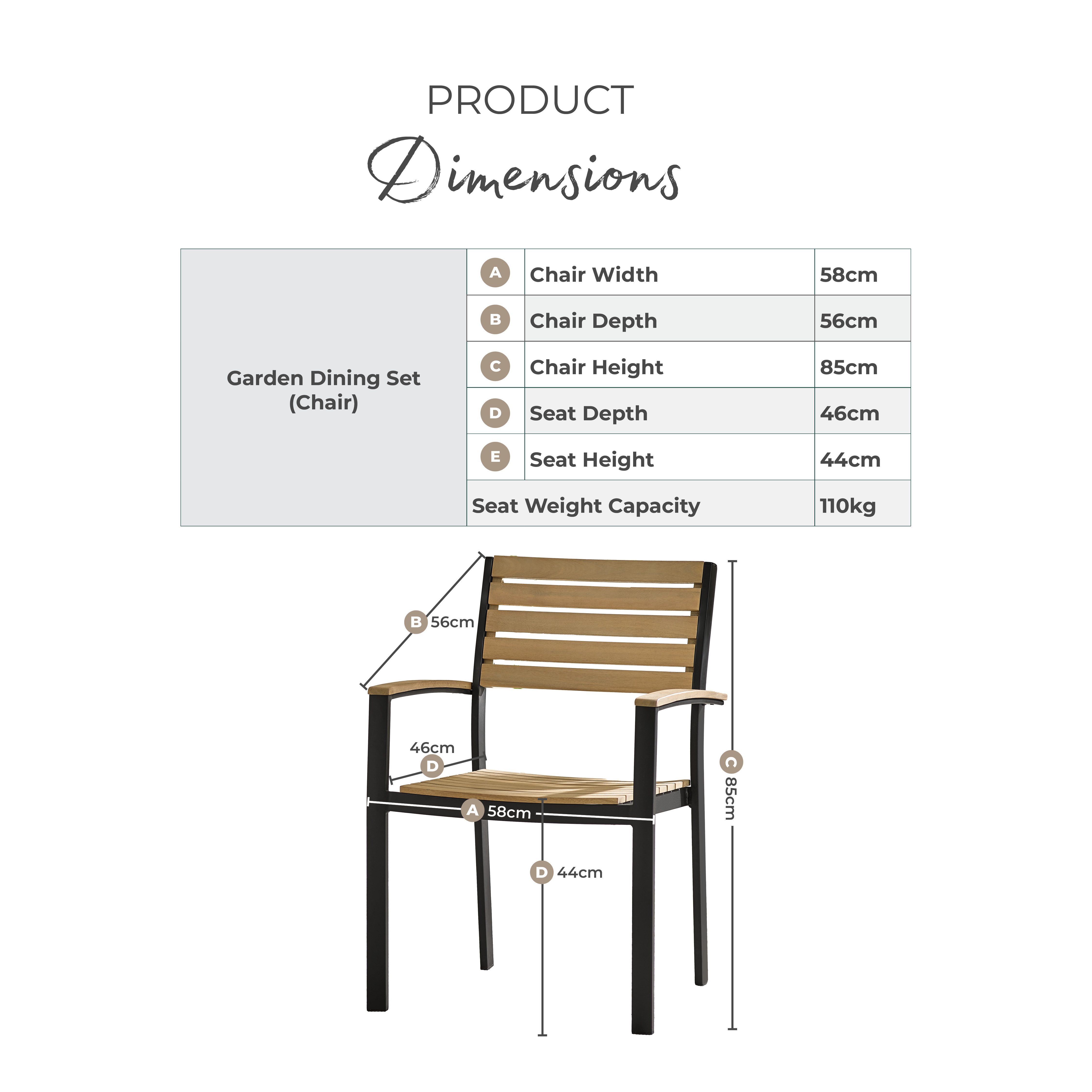 Width (cm) 57 Height (cm) 85 Depth (cm) 56 Colour Natural Material Wood Finish Natural Feature 1 2 outdoor dining chairs Feature 2 Solid FSC® certified eucalyptus wood & black metal Feature 3 Light teak stain colour Feature 4 Sturdy black aluminium frame Feature 5 Comes fully assembled and with 1 year warranty delivery_time Free next working day delivery available on orders before 8pm* delivery_pick_a_day Pick a delivery day to suit you delivery_door_to_door Door to door delivery. Delivery to flats cannot be taken up stairs or in lifts Chair Finish Natural Chair Frame Material Wood Feet Material Plastic UV Resistant Yes Chair Frame Colour Black Chair Depth (cm) 56 Chair Width (cm) 58 Chair Height (cm) 85 Chair Back Height (cm) 41 Seating Depth (cm) 46 Chair Weight (kg) 5 Seat Height (cm) 44 Arm Height (cm) 63 Seat Weight Capacity PP (kg) 110 Table Weight Capacity (kg) 50 Product Weight (kg) 9 Assembly Details Assembly Required Date Listed 2025-02-06T00:00:00.000Z merch_category Garden Dining Chairs _promo_message Garden Sale Now On | Free Next Day Delivery Number Of Seats 2 Display Variant Yes Swatch Colour Wood Water Resistant Cushion Yes Table Surface Thickness (cm) 2 merch_rank 1047 USP Feature 1 Solid Wood USP Feature 1 Description Crafted from solid wood for natural strength and stability. USP Feature 2 Powder-Coated Aluminium Frame USP Feature 2 Description Rust-resistant aluminium frame provides strength, stability and long-term outdoor durability. USP Feature 3 UV-Resistant Materials USP Feature 3 Description Designed to help prevent fading and sun damage, maintaining colour and appearance over time. USP Feature 4 No Assembly Needed USP Feature 4 Description Comes fully assembled and ready to enjoy immediately! USP Feature 5 Strong and Sustainable USP Feature 5 Description Eucalyptus is a naturally durable and fast-growing species, balancing strength and sustainability. USP Feature 6 Contemporary Outdoor Styling USP Feature 6 Description Clean lines and modern finishes designed to complement a variety of garden spaces. Collection Malva -