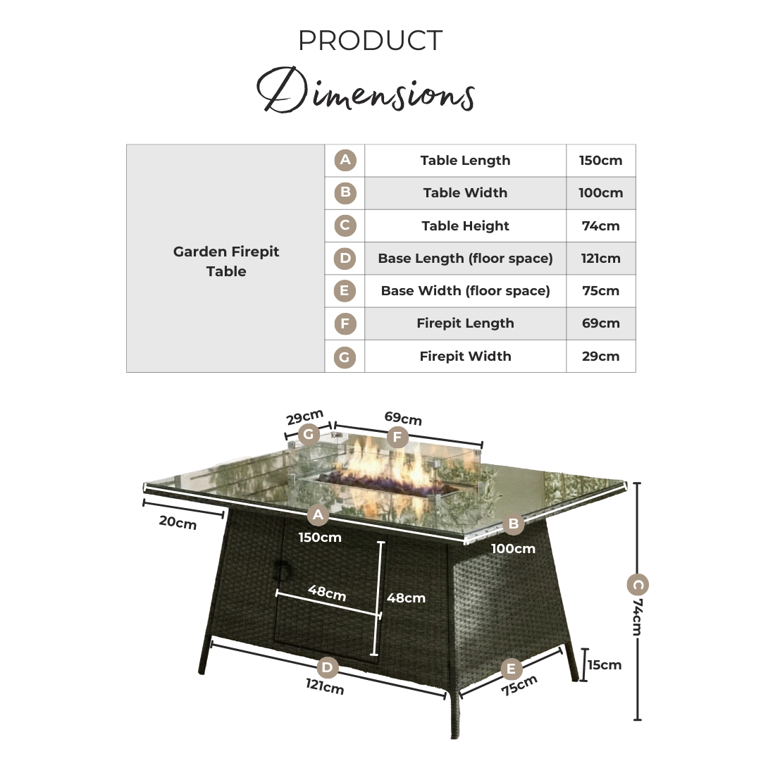 Width (cm) 100 Height (cm) 74 Depth (cm) 150 Sister SKUs MAR-OUT-FIR-DIN-SET-9-GRY Display Variant Yes Colour Beige Material Rattan Finish Rattan Feature 1 Beige PE rattan garden dining table with integrated tabletop firepit & 9 stackable garden chairs Feature 2 Tabletop firepit includes pretty lava rocks & tempered safety glass surround, with hardware to connect to LPG gas cannister (not included) Feature 3 Stackable rattan outdoor chairs for easy storage Feature 4 Simple yet stylish outdoor table and chairs for relaxed dining Feature 5 Includes a FREE water resistant cover + 1 year warranty delivery_time Free next working day delivery available on orders before 8pm* delivery_pick_a_day Pick a delivery day to suit you delivery_door_to_door Door to door delivery. Delivery to flats cannot be taken up stairs or in lifts Chair Finish Rattan Chair Frame Material Metal Feet Material Plastic Chair Upholstery Material Fabric Rattan Type Poly Rattan Water Resistant Cushion Yes Chair Cushion Colour Cream UV Resistant Yes Chair Frame Colour Beige Chair Depth (cm) 72 Chair Width (cm) 66 Chair Height (cm) 79.5 Chair Back Height (cm) 35 Seating Depth (cm) 58 Chair Weight (kg) 11 Seat Height (cm) 45 Arm Height (cm) 63 Seat Padding Thickness (cm) 6 Back Padding Thickness (cm) 6 Table Shape Rectangular Table Colour Beige Table Material Rattan Table Finish Rattan Table Base Width (cm) 76 Table Surface Thickness (cm) 0.5 Table Type Dining table Number Of Seats 9 Table Height (cm) 72 Table Width (cm) 100 Table Length (cm) 150 Seat Weight Capacity PP (kg) 100 Table Weight Capacity (kg) 60 Product Weight (kg) 104.8 Assembly Details Assembly Required Intro Offer? No Date Listed 2026-02-12T00:00:00.000Z Swatch Colour Beige merch_category Firepit Dining Sets _promo_message Garden Sale Now On | Free Next Day Delivery Additional Lead Time 0 merch_rank 592 USP Feature 1 Free Protective Cover Included USP Feature 1 Description Waterproof outdoor cover included at no extra cost to help protect your furniture from rain, dirt and debris when not in use. USP Feature 2 High-Density Double-Weave PE Rattan USP Feature 2 Description Durable synthetic rattan with a textured double weave for a premium look that's built to last outdoors. USP Feature 3 Splash-Proof Cushions USP Feature 3 Description Cushion covers help repel moisture and are quick drying after light rain. USP Feature 4 UV-Resistant Materials USP Feature 4 Description Designed to help prevent fading and sun damage, maintaining colour and appearance over time. USP Feature 5 Tempered Safety Glass Top USP Feature 5 Description Safety-tested tempered glass surface offers enhanced strength and easy cleaning. USP Feature 6 Integrated Fire Pit Table USP Feature 6 Description Provides warmth while doubling as a practical table surface when not in use. Collection Marbella -