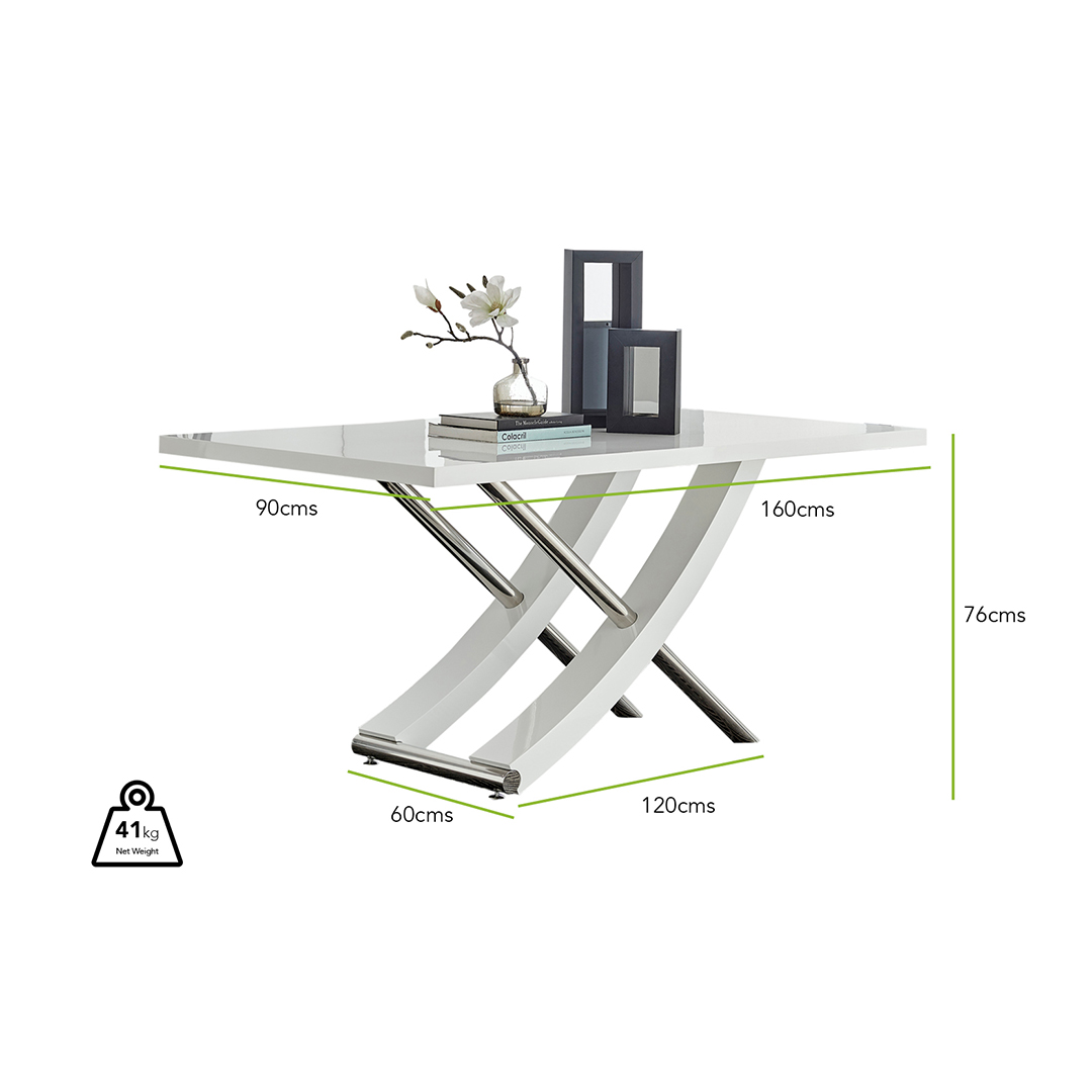 Width (cm) 90 Height (cm) 76 Depth (cm) 160 Feature 1 Stunning dining table capable of modernising any home Feature 2 High quality finish runs throughout Feature 3 Slick white high gloss finish Feature 4 Strong stainless steel support Feature 5 Beautiful design Table Primary Colour White Table Secondary Colour Silver Table Material Manufactured Wood Base Width 47 Storage included? No ExtendingTable No Surface Thickness (cm) 4 Base Length (cm) 105 Base thickness (cm) 2 Max Seating Capacity 6 delivery_time Free next working day delivery available on orders before 8pm* delivery_pick_a_day Pick a delivery day to suit you delivery_door_to_door Door to door delivery. Delivery to flats cannot be taken up stairs or in lifts Table Weight Capacity (kg) 100 Finish High Gloss Product Weight (kg) 40.7 Assembly Details Self Assembly Additional Lead Time 0 Table Family Mayfair Table Shape Rectangular merch_category Dining Tables Colour White Material Engineered Wood PlopID 2772 -