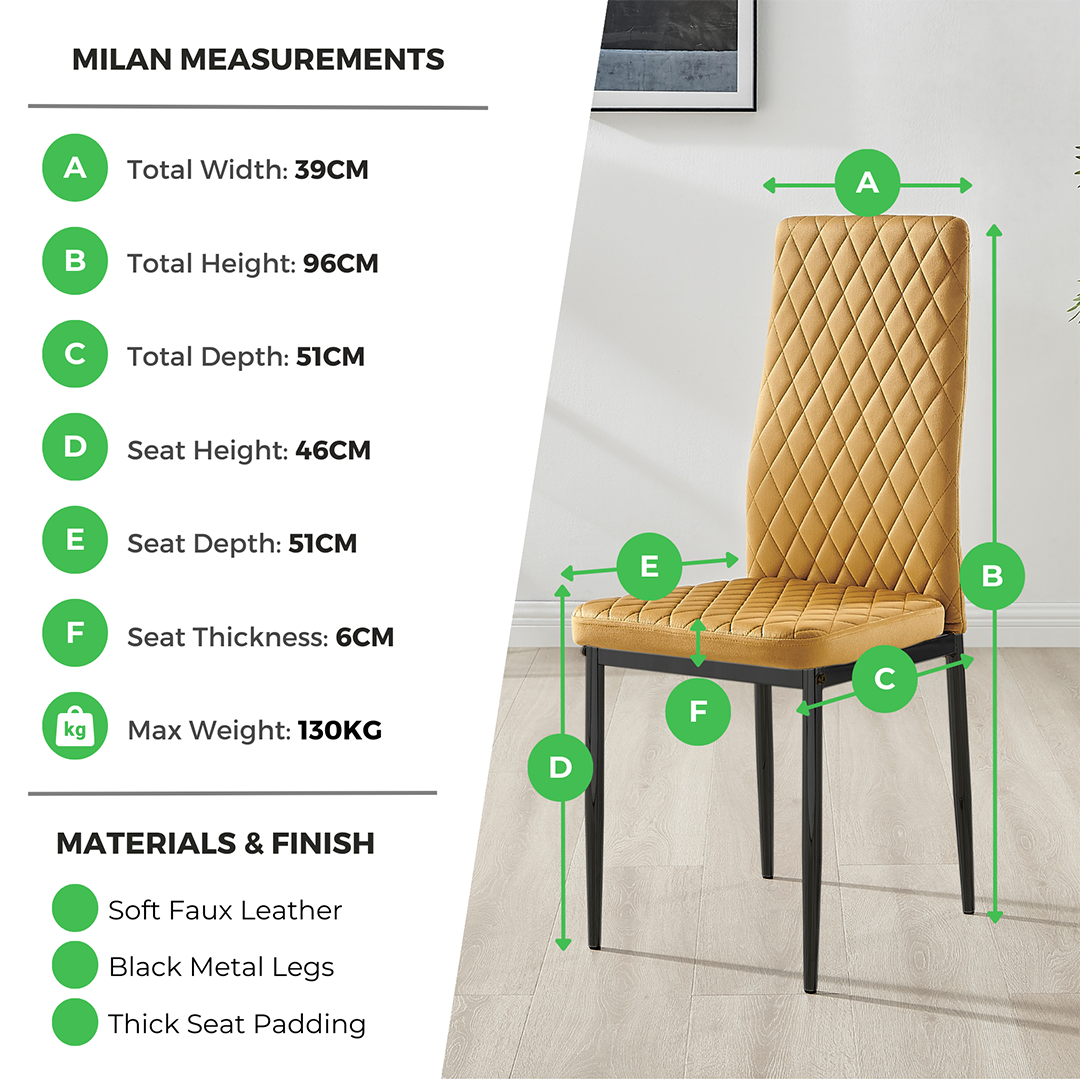 Upholstered in soft touch velvet and finished with diamond pattern stitching the Milan dining chairs would seamlessly fit in with most dining spaces, whilst not compromising on either style or comfort. The stylish black powder coated metal leg and hatched velvet combination gives this chair a contemporary edge, whilst it's simple design allows for practical everyday usage. The chairs are made from high quality durable velvet that's easy to keep clean and are ergonomically designed for maximum comfort and support. They feature a deep foam seat cushion and plastic feet to protect the floor from any damage! At an unbeatable price you cannot go wrong with these chairs!