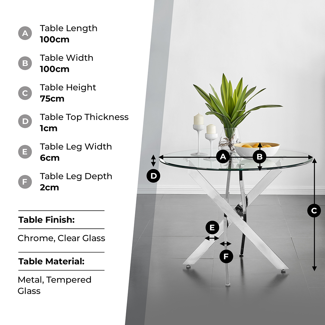 Width (cm) 100 Height (cm) 75 Depth (cm) 100 Table Primary Colour Clear Table Secondary Colour Silver Table Material Metal|Tempered Glass Storage included? No ExtendingTable No Surface Thickness (cm) 1 Max Seating Capacity 4 Table Weight Capacity (kg) 100 Table Family Novara Table Shape Round Novara Chrome Metal 100cm Round Glass Dining Table And 4 Lorenzo Dining Chairs