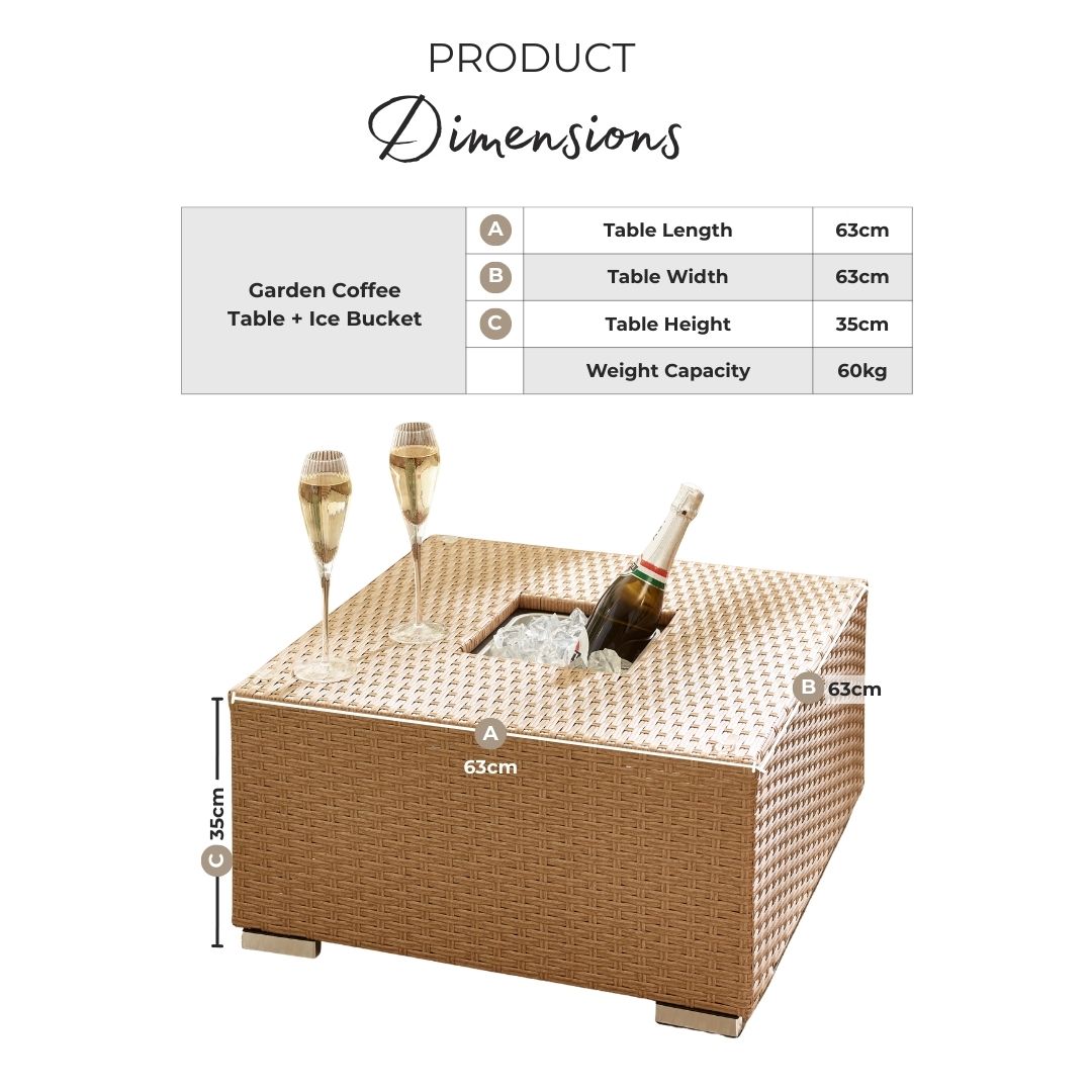 Width (cm) 63 Height (cm) 35 Depth (cm) 63 Display Variant Yes Colour Brown Material Rattan Finish Rattan Feature 1 Beige rattan garden coffee table with integrated ice box Feature 2 Part of our popular Orlando modular garden sofa range, designed to match perfectly Feature 3 Stylish textured beige PE resin rattan over sturdy metal frame Feature 4 Clear tempered glass table top with sunken recess for aluminium ice box. Feature 5 2 year warranty delivery_time Available for pre order delivery_pick_a_day Pick a delivery day to suit you delivery_door_to_door Door to door delivery. Delivery to flats cannot be taken up stairs or in lifts Feet Material Plastic Rattan Type Poly Rattan Water Resistant Cushion No UV Resistant Yes Table Shape Square Table Colour Brown Table Material Rattan Table Finish Rattan Table Surface Thickness (cm) 0.5 Table Type Coffee table Table Height (cm) 35 Table Width (cm) 63 Table Length (cm) 63 Table Weight Capacity (kg) 60 Product Weight (kg) 9.49 Assembly Details Assembly Required Intro Offer? No Date Listed 2025-10-01T00:00:00.000Z Swatch Colour Brown merch_category Garden Coffee Tables custom_badge #3d4e55|#ffffff|Limited Pre-Order Table Base Width (cm) 63 Additional Lead Time 14 Sister SKUs ORL-ICE-COF-TBL-GRY,ORL-ICE-COF-TBL-NAT merch_rank 780 promo_bullet IMPORTANT: this is a pre-order item with delivery due April 2026. USP Feature 1 High-Density Double-Weave PE Rattan USP Feature 1 Description Durable synthetic rattan with a textured double weave for a premium look that's built to last outdoors. USP Feature 2 Corrosion-Resistant Aluminium Frame USP Feature 2 Description Powder-coated aluminium construction helps prevent rust and corrosion over time. USP Feature 3 UV-Resistant Materials USP Feature 3 Description Designed to help prevent fading and sun damage, maintaining colour and appearance over time. USP Feature 4 Stylish Yet Functional Design USP Feature 4 Description Combines contemporary outdoor styling with everyday practicality. USP Feature 5 Tempered Safety Glass Top USP Feature 5 Description Safety-tested tempered glass surface offers enhanced strength and easy cleaning. USP Feature 6 Integrated Ice Bucket Table USP Feature 6 Description Built-in ice bucket feature enhances your outdoor dining and entertaining experience. Collection Orlando USP Feature 1 Image https://s3-eu-west-1.amazonaws.com/cdn.production.aws.eu-w1.pimberly.com/public/asset/raw/5fbbce1a2fd14f001bd75232/b23ec491/69bc363f630ee76c7b000069/ORL-ICE-COF-TBL-BRN_USP1.jpg USP Feature 2 Image https://s3-eu-west-1.amazonaws.com/cdn.production.aws.eu-w1.pimberly.com/public/asset/raw/5fbbce1a2fd14f001bd75232/b23ec491/69bc363f630ee76c7b00006a/ORL-ICE-COF-TBL-BRN_USP2.jpg USP Feature 5 Image https://s3-eu-west-1.amazonaws.com/cdn.production.aws.eu-w1.pimberly.com/public/asset/raw/5fbbce1a2fd14f001bd75232/b23ec491/69bc363f630ee76c7b00006c/ORL-ICE-COF-TBL-BRN_USP5.jpg USP Feature 6 Image https://s3-eu-west-1.amazonaws.com/cdn.production.aws.eu-w1.pimberly.com/public/asset/raw/5fbbce1a2fd14f001bd75232/b23ec491/69bc363f630ee76c7b00006d/ORL-ICE-COF-TBL-BRN_USP6.jpg USP Feature 4 Image https://s3-eu-west-1.amazonaws.com/cdn.production.aws.eu-w1.pimberly.com/public/asset/raw/5fbbce1a2fd14f001bd75232/b23ec491/69bc363f630ee76c7b00006b/ORL-ICE-COF-TBL-BRN_USP4.jpg _promo_message Limited Pre-Order - Get Ready for Summer USP Feature 3 Image https://s3-eu-west-1.amazonaws.com/cdn.production.aws.eu-w1.pimberly.com/public/asset/raw/5fbbce1a2fd14f001bd75232/b850f3dd/69bd6fc004511b4488000077/ORL-ICE-COF-TBL-BRN_USP3.png -
