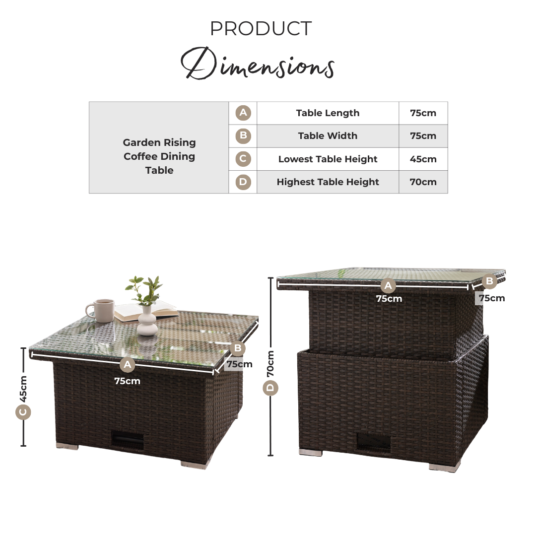 Width (cm) 75 Height (cm) 70 Depth (cm) 75 Sister SKUs ORL-ADJ-DIN-TBL-BRN Display Variant Yes Colour Grey Material Rattan Finish Rattan Feature 1 Grey rattan garden rising coffee table - dining table Feature 2 Part of our popular Orlando modular garden sofa range, designed to match perfectly Feature 3 Stylish textured grey PE resin rattan over sturdy metal frame Feature 4 Simple lift-and-lock height adjustable mechanism Feature 5 2 year warranty delivery_time Free next working day delivery available on orders before 8pm* delivery_pick_a_day Pick a delivery day to suit you delivery_door_to_door Door to door delivery. Delivery to flats cannot be taken up stairs or in lifts Feet Material Plastic Rattan Type Poly Rattan Water Resistant Cushion No UV Resistant Yes Table Shape Square Table Colour Grey Table Material Rattan Table Finish Rattan Table Base Width (cm) 75 Table Surface Thickness (cm) 0.5 Table Type Coffee table Table Height (cm) 70 Table Width (cm) 75 Table Length (cm) 75 Table Weight Capacity (kg) 60 Product Weight (kg) 20.1 Assembly Details Assembly Required Intro Offer? No Date Listed 2025-10-01T00:00:00.000Z Swatch Colour Grey merch_category Garden Rising Tables merch_rank 981 Additional Lead Time 0 USP Feature 1 High-Density Double-Weave PE Rattan USP Feature 1 Description Durable synthetic rattan with a textured double weave for a premium look that's built to last outdoors. USP Feature 2 UV-Resistant Materials USP Feature 2 Description Designed to help prevent fading and sun damage, maintaining colour and appearance over time. USP Feature 3 Height-Adjustable Table Mechanism USP Feature 3 Description Smooth lift-and-lock system allows you to transition between coffee and dining height with ease. USP Feature 4 Tempered Safety Glass Top USP Feature 4 Description Safety-tested tempered glass surface offers enhanced strength and easy cleaning. USP Feature 5 Easy Clean USP Feature 5 Description Smooth, wipe-clean surfaces make everyday cleaning quick and hassle-free. USP Feature 6 Stylish Yet Functional Design USP Feature 6 Description Combines contemporary outdoor styling with everyday practicality. Collection Orlando _promo_message Extra Saving | 10% off £500+ | 15% off £1000+| Use Code: SPRINGSAVE USP Feature 1 Image https://s3-eu-west-1.amazonaws.com/cdn.production.aws.eu-w1.pimberly.com/public/asset/raw/5fbbce1a2fd14f001bd75232/b850f3dd/69bd6fc004511b4488000069/ORL-ADJ-DIN-TBL-GRY_USP1.jpg USP Feature 3 Image https://s3-eu-west-1.amazonaws.com/cdn.production.aws.eu-w1.pimberly.com/public/asset/raw/5fbbce1a2fd14f001bd75232/b850f3dd/69bd6fc004511b448800006b/ORL-ADJ-DIN-TBL-GRY_USP3.jpg USP Feature 4 Image https://s3-eu-west-1.amazonaws.com/cdn.production.aws.eu-w1.pimberly.com/public/asset/raw/5fbbce1a2fd14f001bd75232/b850f3dd/69bd6fc004511b448800006c/ORL-ADJ-DIN-TBL-GRY_USP4.jpg USP Feature 5 Image https://s3-eu-west-1.amazonaws.com/cdn.production.aws.eu-w1.pimberly.com/public/asset/raw/5fbbce1a2fd14f001bd75232/b850f3dd/69bd6fc004511b448800006d/ORL-ADJ-DIN-TBL-GRY_USP5.jpg USP Feature 6 Image https://s3-eu-west-1.amazonaws.com/cdn.production.aws.eu-w1.pimberly.com/public/asset/raw/5fbbce1a2fd14f001bd75232/b850f3dd/69bd6fc004511b448800006e/ORL-ADJ-DIN-TBL-GRY_USP6.jpg USP Feature 2 Image https://s3-eu-west-1.amazonaws.com/cdn.production.aws.eu-w1.pimberly.com/public/asset/raw/5fbbce1a2fd14f001bd75232/b850f3dd/69bd6fc004511b448800006a/ORL-ADJ-DIN-TBL-GRY_USP2.png custom_badge #914e3b|#ffffff|Up to 15% Off -