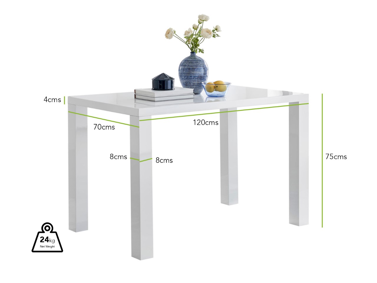 Width (cm) 70 Height (cm) 75 Depth (cm) 120 Table Primary Colour Grey Table Material Manufactured Wood Storage included? No ExtendingTable No Base thickness (cm) 4 Surface Thickness (cm) 4 Max Seating Capacity 4 Table Weight Capacity (kg) 100 Table Secondary Colour Grey Table Family Pivero Table Shape Rectangular Pivero 4 Grey High Gloss Dining Table And 4 Modern Milan Chairs Set