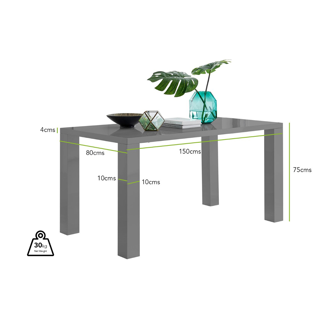 Width (cm) 80 Height (cm) 75 Depth (cm) 150 Table Primary Colour Grey Table Material Manufactured Wood Storage included? No ExtendingTable No Surface Thickness (cm) 4 Base thickness (cm) 4 Max Seating Capacity 6 Table Weight Capacity (kg) 100 Table Secondary Colour Grey Table Family Pivero Table Shape Rectangular Pivero Grey High Gloss Dining Table and 6 Lorenzo Dining Chairs