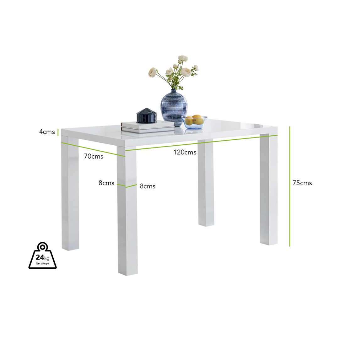Width (cm) 70 Height (cm) 75 Depth (cm) 120 Table Primary Colour White Table Material Manufactured Wood Storage included? No ExtendingTable No Base thickness (cm) 4 Surface Thickness (cm) 4 Max Seating Capacity 4 Table Weight Capacity (kg) 100 Table Secondary Colour White Table Family Pivero Table Shape Rectangular Pivero White High Gloss Dining Table and 4 Milan Chairs Set