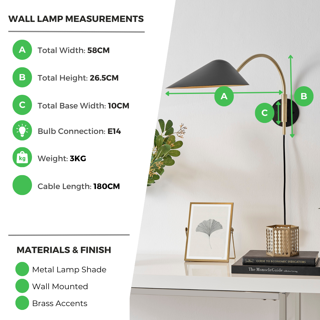 Width (cm) 58 Height (cm) 26 Depth (cm) 26 Colour Black Finish Matte Feature 1 Wall lamp in matte black with gold-brass accents Feature 2 Perfect wall lighting for living rooms, bedrooms, dining rooms Feature 3 Black metal triangular shade with gold-brass interior and wall mount Feature 4 Modern lighting with vintage retro design inspiration Feature 5 2 year warranty Light Diameter (cm) 26.5 Light Dimmable (cm) No Maximum Fitting Watt 18w Light Socket Power Rating IP20 Bulbs Included No Bulb Cap Fitting E14 delivery_time Free next working day delivery available delivery_pick_a_day Pick a delivery day to suit you delivery_door_to_door Door to door delivery. Delivery to flats cannot be taken up stairs or in lifts Light Shade Colour Black Light Stand Colour Brass Product Weight (kg) 1.1 Additional Lead Time 0 merch_category Lighting Light Fixture Type Wall Lamp Material Metal Display Variant Yes custom_badge #000000|#FFFFFF|Black Friday _promo_message Limited Black Friday Deals – Whilst Stocks Last! -