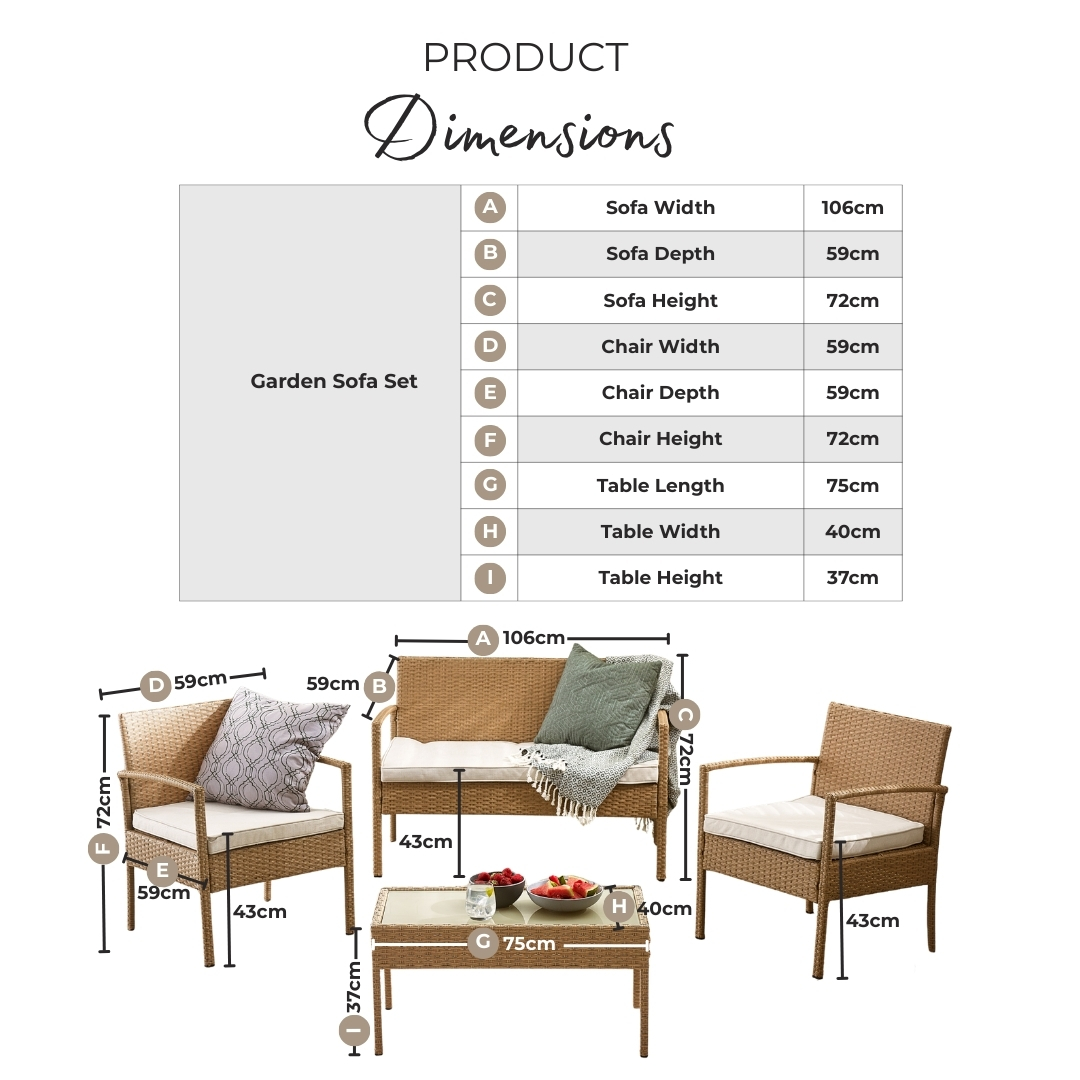 Width (cm) 106 Height (cm) 72 Depth (cm) 59 Colour Grey Feature 1 Compact grey rattan garden furniture set - 2 seat sofa, 2 chairs, coffee table Feature 2 Modern, simple and elegant design of straight lines Feature 3 Weather-resistant PE rattan on steel frame and tempered glass coffee table top Feature 4 Soft padded grey cushions are splash-proof Feature 5 Includes a FREE water resistant cover Chair Finish Rattan Chair Frame Material Metal Feet Material Metal Chair Upholstery Material Fabric Rattan Type Poly Rattan Water Resistant Cushion Yes Chair Cushion Colour Grey UV Resistant Yes Chair Frame Colour Grey Chair Depth (cm) 59 Chair Width (cm) 59 Chair Height (cm) 72 Chair Back Height (cm) 36 Seating Depth (cm) 48 Chair Weight (kg) 6.4 Seat Height (cm) 43 Arm Height (cm) 57 Seat Padding Thickness (cm) 5 Table Shape Rectangular Table Colour Grey Table Material Rattan Table Base Width (cm) 40 Table Surface Thickness (cm) 0.5 Table Type Coffee table Number Of Seats 4 Table Height (cm) 37 Table Width (cm) 40 Table Length (cm) 75 Seat Weight Capacity PP (kg) 120 Table Weight Capacity (kg) 35 delivery_time Free next working day delivery available on orders before 8pm* delivery_pick_a_day Pick a delivery day to suit you delivery_door_to_door Door to door delivery. Delivery to flats cannot be taken up stairs or in lifts Product_Stock_Type stocked Product Weight (kg) 30 Assembly Details Assembly Required Material Rattan merch_category Garden Sofa Sets Finish Rattan _promo_message Garden Sale Now On | Free Next Day Delivery Sister SKUs POR-OUT-SOF-4-NAT Swatch Colour Grey Additional Lead Time 0 Table Finish Rattan merch_rank 1405 USP Feature 1 Free Protective Cover Included USP Feature 1 Description Waterproof outdoor cover included at no extra cost to help protect your furniture from rain, dirt and debris when not in use. USP Feature 2 High-Density Double-Weave PE Rattan USP Feature 2 Description Durable synthetic rattan with a textured double weave for a premium look that's built to last outdoors. USP Feature 3 Splash-Proof Cushions USP Feature 3 Description Cushion covers help repel moisture and are quick drying after light rain. USP Feature 4 UV-Resistant Materials USP Feature 4 Description Designed to help prevent fading and sun damage, maintaining colour and appearance over time. USP Feature 5 Tempered Safety Glass Top USP Feature 5 Description Safety-tested tempered glass surface offers enhanced strength and easy cleaning. USP Feature 6 Durable Tempered Glass Surface USP Feature 6 Description Strong, easy-clean glass tabletop designed for everyday outdoor use. Collection Porto USP Feature 1 Image https://s3-eu-west-1.amazonaws.com/cdn.production.aws.eu-w1.pimberly.com/public/asset/raw/5fbbce1a2fd14f001bd75232/23a93167/69bc217804511b42cc0002c1/POR-OUT-SOF-4-GRY_USP1.jpg USP Feature 2 Image https://s3-eu-west-1.amazonaws.com/cdn.production.aws.eu-w1.pimberly.com/public/asset/raw/5fbbce1a2fd14f001bd75232/23a93167/69bc217804511b42cc0002c2/POR-OUT-SOF-4-GRY_USP2.jpg USP Feature 3 Image https://s3-eu-west-1.amazonaws.com/cdn.production.aws.eu-w1.pimberly.com/public/asset/raw/5fbbce1a2fd14f001bd75232/23a93167/69bc217804511b42cc0002c3/POR-OUT-SOF-4-GRY_USP3.jpg USP Feature 5 Image https://s3-eu-west-1.amazonaws.com/cdn.production.aws.eu-w1.pimberly.com/public/asset/raw/5fbbce1a2fd14f001bd75232/23a93167/69bc217804511b42cc0002c5/POR-OUT-SOF-4-GRY_USP5.jpg USP Feature 6 Image https://s3-eu-west-1.amazonaws.com/cdn.production.aws.eu-w1.pimberly.com/public/asset/raw/5fbbce1a2fd14f001bd75232/23a93167/69bc217804511b42cc0002c6/POR-OUT-SOF-4-GRY_USP6.jpg Display Variant Yes USP Feature 4 Image https://s3-eu-west-1.amazonaws.com/cdn.production.aws.eu-w1.pimberly.com/public/asset/raw/5fbbce1a2fd14f001bd75232/23a93167/69bc217804511b42cc0002c4/POR-OUT-SOF-4-GRY_USP4.png -