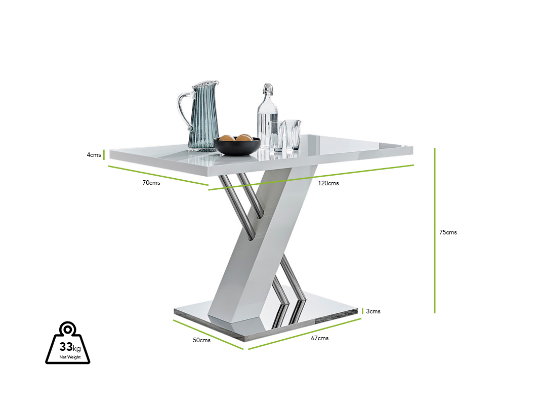 Width (cm) 70 Height (cm) 76 Depth (cm) 120 Table Primary Colour White Table Secondary Colour Silver Table Material Engineered Wood Storage included? No ExtendingTable No Base Width (cm) 50 Surface Thickness (cm) 4 Base Length (cm) 70 Base thickness (cm) 3 Max Seating Capacity 4 Table Weight Capacity (kg) 100 Table Family Sorrento Table Shape Rectangular Sorrento 4 White High Gloss And Chrome Dining Table And 4 Lorenzo Chairs Set