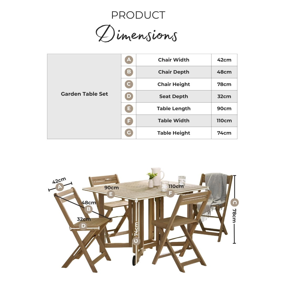 Width (cm) 90 Height (cm) 74 Depth (cm) 110 Colour Natural Material Wood Finish Natural Feature 1 Solid FSC® certified acacia wood outdoor dining set in teak stain colour Feature 2 Features drop leaf folding outdoor table & 4 folding wooden chairs Feature 3 Chairs slot inside table when flat for easy storage Feature 4 No assembly required Feature 5 Comes fully assembled and with 1 year warranty delivery_time Free next working day delivery available on orders before 8pm* delivery_pick_a_day Pick a delivery day to suit you delivery_door_to_door Door to door delivery. Delivery to flats cannot be taken up stairs or in lifts Chair Finish Natural Chair Frame Material Wood Feet Material Plastic UV Resistant Yes Chair Frame Colour Natural Chair Depth (cm) 48 Chair Width (cm) 42 Chair Height (cm) 78 Chair Back Height (cm) 33 Seating Depth (cm) 32 Chair Weight (kg) 3.2 Seat Height (cm) 45 Table Shape Rectangular Table Colour Natural Table Material Wood Table Finish Natural Table Base Width (cm) 90 Table Surface Thickness (cm) 1.8 Table Type Dining table Number Of Seats 4 Table Height (cm) 74 Table Width (cm) 90 Table Length (cm) 110 Seat Weight Capacity PP (kg) 110 Table Weight Capacity (kg) 75 Product Weight (kg) 30 Assembly Details Assembly Required Date Listed 2025-01-28T00:00:00.000Z Additional Lead Time 0 merch_category Garden Dining Sets _promo_message Garden Sale Now On | Free Next Day Delivery Display Variant Yes Swatch Colour Wood Water Resistant Cushion Yes merch_rank 294 USP Feature 1 Solid Wood USP Feature 1 Description Crafted from solid wood for natural strength and stability. USP Feature 2 Exceptionally Durable & Long-Lasting USP Feature 2 Description Acacia is a dense hardwood that resists scratches, dents, and everyday wear- ideal for dining and living furniture that sees regular use. USP Feature 3 Space-Saving Outdoor Design USP Feature 3 Description Ideal for patios, balconies and smaller garden areas. USP Feature 4 No Assembly Needed USP Feature 4 Description Comes fully assembled and ready to enjoy immediately! USP Feature 5 Natural & Unique Finish USP Feature 5 Description Acacia Wood has a rich, unique grain pattern giving your space an individual, artisanal feel. USP Feature 6 Foldable Design for Easy Storage USP Feature 6 Description Folds down quickly and compactly, making it easy to store away when not in use and ideal for saving space. Collection Stowaway USP Feature 1 Image https://s3-eu-west-1.amazonaws.com/cdn.production.aws.eu-w1.pimberly.com/public/asset/raw/5fbbce1a2fd14f001bd75232/23a93167/69bc217804511b42cc0002e5/STOW-OUT-DIN-SET-NAT-4_USP1.jpg USP Feature 2 Image https://s3-eu-west-1.amazonaws.com/cdn.production.aws.eu-w1.pimberly.com/public/asset/raw/5fbbce1a2fd14f001bd75232/23a93167/69bc217804511b42cc0002e6/STOW-OUT-DIN-SET-NAT-4_USP2.jpg USP Feature 3 Image https://s3-eu-west-1.amazonaws.com/cdn.production.aws.eu-w1.pimberly.com/public/asset/raw/5fbbce1a2fd14f001bd75232/23a93167/69bc217804511b42cc0002e7/STOW-OUT-DIN-SET-NAT-4_USP3.jpg USP Feature 4 Image https://s3-eu-west-1.amazonaws.com/cdn.production.aws.eu-w1.pimberly.com/public/asset/raw/5fbbce1a2fd14f001bd75232/23a93167/69bc217804511b42cc0002e8/STOW-OUT-DIN-SET-NAT-4_USP4.jpg USP Feature 5 Image https://s3-eu-west-1.amazonaws.com/cdn.production.aws.eu-w1.pimberly.com/public/asset/raw/5fbbce1a2fd14f001bd75232/23a93167/69bc217804511b42cc0002e9/STOW-OUT-DIN-SET-NAT-4_USP5.jpg USP Feature 6 Image https://s3-eu-west-1.amazonaws.com/cdn.production.aws.eu-w1.pimberly.com/public/asset/raw/5fbbce1a2fd14f001bd75232/23a93167/69bc217804511b42cc0002ea/STOW-OUT-DIN-SET-NAT-4_USP6.jpg -