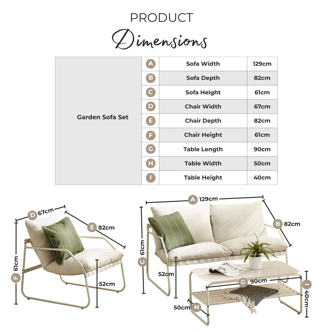 Width (cm) 50 Height (cm) 40 Depth (cm) 90 Sister SKUs SYRO-OUT-SOF-SET-BRY-4,SYRO-OUT-SOF-SET-CRM-4 Display Variant Yes Colour Green Material Metal Finish Powder Coated Feature 1 Stylish green outdoor seating set - 2 chairs, 2-seat sofa & matching table Feature 2 Green powder coated metal with plump cream fabric cushions Feature 3 Simple modern design with nods to retro styles Feature 4 Sturdy and highly durable outdoor furniture Feature 5 2 year warranty delivery_time Free next working day delivery available on orders before 8pm* delivery_pick_a_day Pick a delivery day to suit you delivery_door_to_door Door to door delivery. Delivery to flats cannot be taken up stairs or in lifts Chair Finish Powder Coated Chair Frame Material Metal Feet Material Plastic Chair Upholstery Material Fabric Water Resistant Cushion Yes Chair Cushion Colour Cream UV Resistant Yes Chair Frame Colour Green Chair Depth (cm) 82 Chair Width (cm) 67 Chair Height (cm) 61 Chair Back Height (cm) 48 Seating Depth (cm) 47 Chair Weight (kg) 6 Seat Height (cm) 52 Arm Height (cm) 56 Seat Padding Thickness (cm) 15 Back Padding Thickness (cm) 15 Table Shape Rectangular Table Colour Green Table Material Metal Table Finish Powder Coated Table Base Width (cm) 50 Table Surface Thickness (cm) 0.5 Table Type Coffee table Number Of Seats 4 Table Height (cm) 40 Table Width (cm) 50 Table Length (cm) 90 Seat Weight Capacity PP (kg) 120 Table Weight Capacity (kg) 30 Product Weight (kg) 31 Assembly Details Assembly Required Intro Offer? No Date Listed 2025-10-01T00:00:00.000Z Swatch Colour Green merch_category Garden Sofa Sets _promo_message Garden Sale Now On | Free Next Day Delivery Additional Lead Time 0 merch_rank 93 USP Feature 1 Powder-Coated Aluminium Frame USP Feature 1 Description Rust-resistant aluminium frame provides strength, stability and long-term outdoor durability. USP Feature 2 Corrosion-Resistant Aluminium Frame USP Feature 2 Description Powder-coated aluminium construction helps prevent rust and corrosion over time. USP Feature 3 UV-Resistant Materials USP Feature 3 Description Designed to help prevent fading and sun damage, maintaining colour and appearance over time. USP Feature 4 Splash-Proof Cushions USP Feature 4 Description Cushion covers help repel moisture and are quick drying after light rain. USP Feature 5 Deep-Filled Supportive Cushions USP Feature 5 Description Generously padded cushions designed for lasting comfort during extended use. USP Feature 6 Tempered Safety Glass Top USP Feature 6 Description Safety-tested tempered glass surface offers enhanced strength and easy cleaning. Collection Syros USP Feature 1 Image https://s3-eu-west-1.amazonaws.com/cdn.production.aws.eu-w1.pimberly.com/public/asset/raw/5fbbce1a2fd14f001bd75232/b330bcdf/69c676579738fa296a000045/SYRO-OUT-SOF-SET-GRN-4_USP1.jpg USP Feature 2 Image https://s3-eu-west-1.amazonaws.com/cdn.production.aws.eu-w1.pimberly.com/public/asset/raw/5fbbce1a2fd14f001bd75232/b330bcdf/69c676579738fa296a000046/SYRO-OUT-SOF-SET-GRN-4_USP2.jpg USP Feature 4 Image https://s3-eu-west-1.amazonaws.com/cdn.production.aws.eu-w1.pimberly.com/public/asset/raw/5fbbce1a2fd14f001bd75232/b330bcdf/69c676579738fa296a000048/SYRO-OUT-SOF-SET-GRN-4_USP4.jpg USP Feature 5 Image https://s3-eu-west-1.amazonaws.com/cdn.production.aws.eu-w1.pimberly.com/public/asset/raw/5fbbce1a2fd14f001bd75232/b330bcdf/69c676579738fa296a000049/SYRO-OUT-SOF-SET-GRN-4_USP5.jpg USP Feature 6 Image https://s3-eu-west-1.amazonaws.com/cdn.production.aws.eu-w1.pimberly.com/public/asset/raw/5fbbce1a2fd14f001bd75232/b330bcdf/69c676579738fa296a00004a/SYRO-OUT-SOF-SET-GRN-4_USP6.jpg USP Feature 3 Image https://s3-eu-west-1.amazonaws.com/cdn.production.aws.eu-w1.pimberly.com/public/asset/raw/5fbbce1a2fd14f001bd75232/b330bcdf/69c676579738fa296a000047/SYRO-OUT-SOF-SET-GRN-4_USP3.png -
