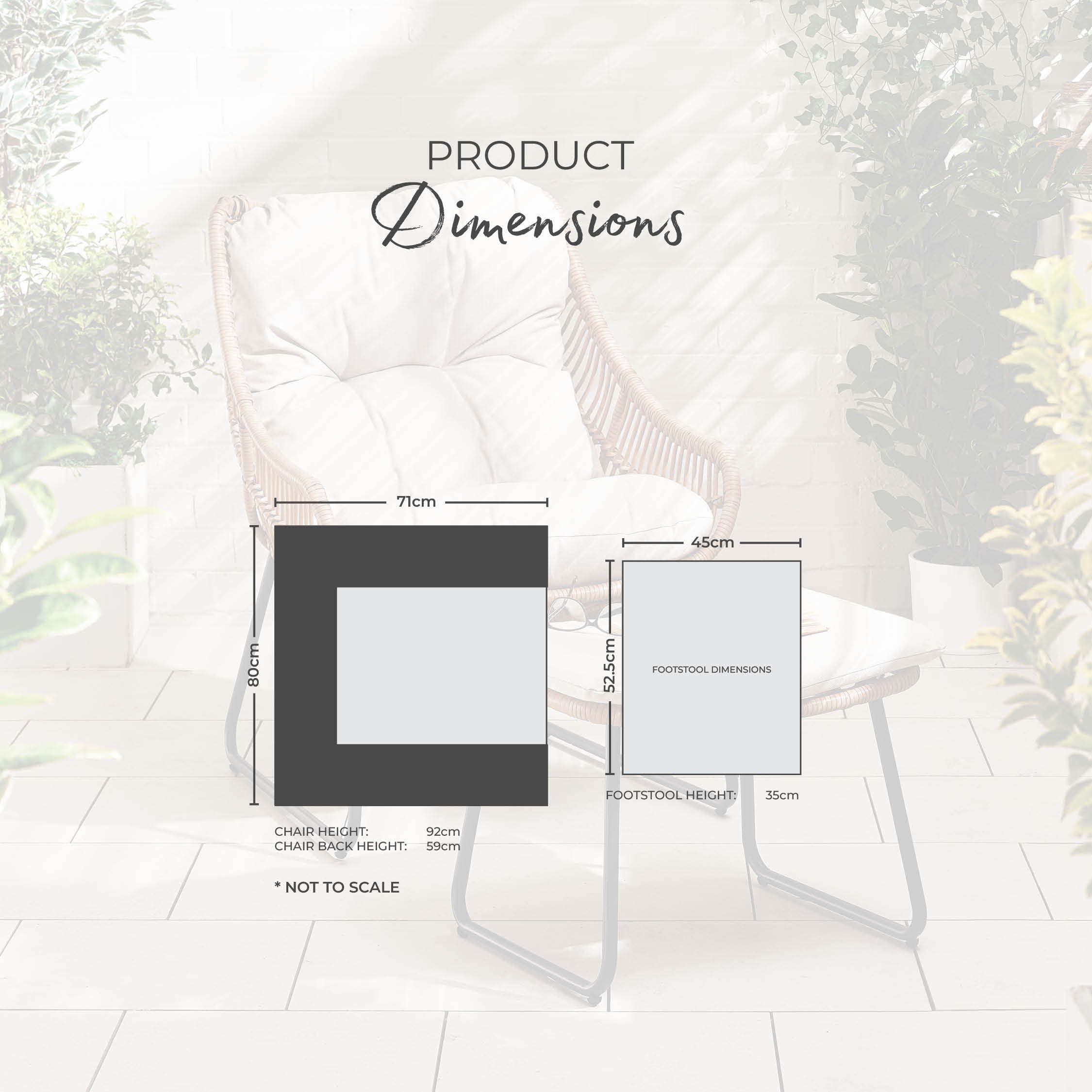 Width (cm) 80 Height (cm) 92 Depth (cm) 71 Display Variant Yes Colour Brown Material Rattan Finish Rattan Feature 1 Large beige rattan and black steel metal chair with greige cushions + footstool, for indoor 7 outdoor use Feature 2 Modern boho laid back style with Industrial flair Feature 3 On-trend black steel metal trapezoid legs Feature 4 UV and weather resistant frame, splash-proof cushions Feature 5 1 year warranty delivery_time Free next working day delivery available on orders before 8pm* delivery_pick_a_day Pick a delivery day to suit you delivery_door_to_door Door to door delivery. Delivery to flats cannot be taken up stairs or in lifts Chair Finish Rattan Chair Frame Material Metal Feet Material Metal Chair Upholstery Material Polyester Rattan Type Poly Rattan Water Resistant Cushion Yes Chair Cushion Colour Light Grey UV Resistant Yes Chair Frame Colour Brown Chair Depth (cm) 71 Chair Width (cm) 80 Chair Height (cm) 92 Chair Back Height (cm) 59 Seating Depth (cm) 54 Chair Weight (kg) 9.1 Seat Height (cm) 40 Arm Height (cm) 57 Seat Padding Thickness (cm) 12 Back Padding Thickness (cm) 12 Number Of Seats 1 Seat Weight Capacity PP (kg) 120 Product Weight (kg) 12.5 Assembly Details Assembly Required Intro Offer? No Date Listed 2025-09-25T00:00:00.000Z merch_category Accent Chairs -