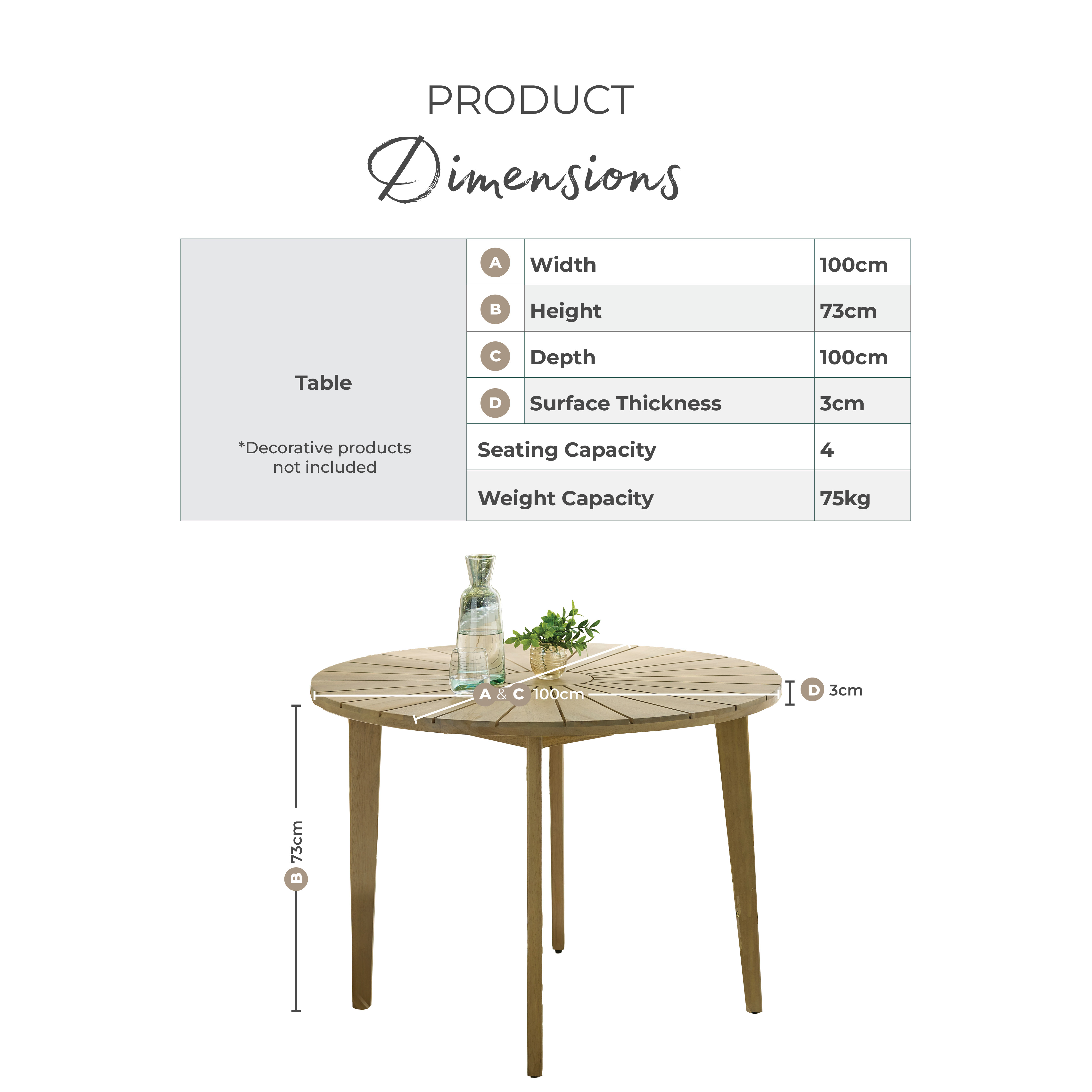 Width (cm) 100 Height (cm) 73 Depth (cm) 100 Colour Natural Material Wood Finish Natural Feature 1 Solid wood outdoor round dining table Feature 2 Solid FSC® certified acacia wood in teak stain colour Feature 3 Seats up to 4 Feature 4 Beautiful sundial pattern to tabletop Feature 5 1 year warranty delivery_time Available for pre order delivery_pick_a_day Pick a delivery day to suit you delivery_door_to_door Door to door delivery. Delivery to flats cannot be taken up stairs or in lifts Chair Finish Natural Chair Frame Material Wood Feet Material Plastic UV Resistant Yes Chair Frame Colour Natural Table Shape Round Table Colour Natural Table Material Wood Table Finish Natural Table Base Width (cm) 100 Table Surface Thickness (cm) 1 Table Type Dining table Number Of Seats 4 Table Height (cm) 73 Table Width (cm) 100 Table Length (cm) 100 Table Weight Capacity (kg) 75 Product Weight (kg) 12.2 Assembly Details Assembly Required Date Listed 2025-02-28T00:00:00.000Z merch_category Garden Dining Tables custom_badge #3d4e55|#ffffff|Limited Pre-Order Display Variant Yes Swatch Colour Wood Additional Lead Time 71 Water Resistant Cushion Yes merch_rank 1689 promo_bullet IMPORTANT: this is a pre-order item with delivery due May 2026. USP Feature 1 Solid Wood USP Feature 1 Description Crafted from solid wood for natural strength and stability. USP Feature 2 Exceptionally Durable & Long-Lasting USP Feature 2 Description Acacia is a dense hardwood that resists scratches, dents, and everyday wear- ideal for dining and living furniture that sees regular use. USP Feature 3 UV-Resistant Materials USP Feature 3 Description Designed to help prevent fading and sun damage, maintaining colour and appearance over time. USP Feature 4 Contemporary Outdoor Styling USP Feature 4 Description Clean lines and modern finishes designed to complement a variety of garden spaces. USP Feature 5 Natural & Unique Finish USP Feature 5 Description Acacia Wood has a rich, unique grain pattern giving your space an individual, artisanal feel. USP Feature 6 Easy Assembly USP Feature 6 Description Designed for simple assembly with clear instructions included. Collection Tari _promo_message Limited Pre-Order - Get Ready for Summer -